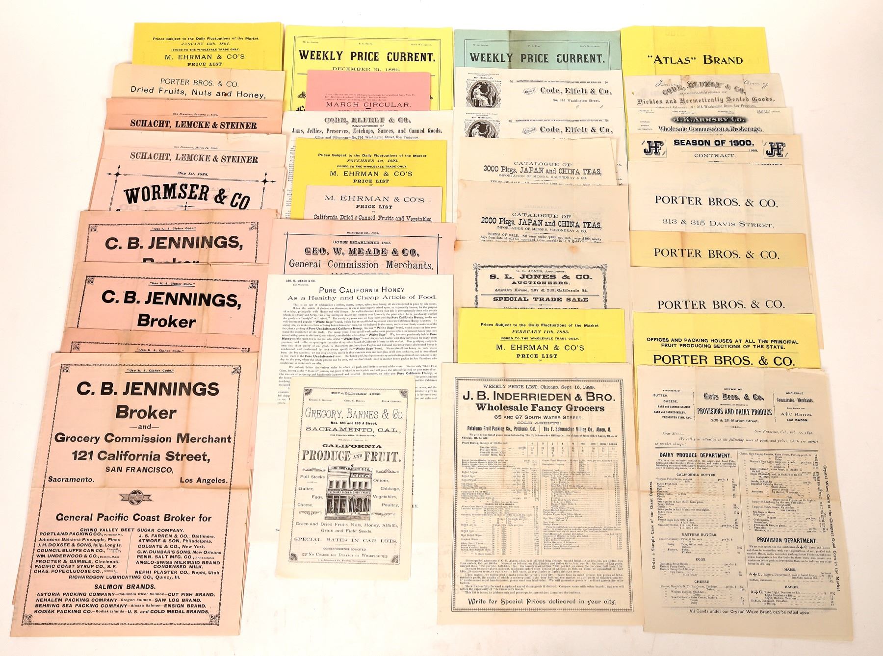 About 40 California pricelists, mostly 1800's. Grape sugar, fruits, pickles, honey, jam, tea, fish etc. California c. 1800s