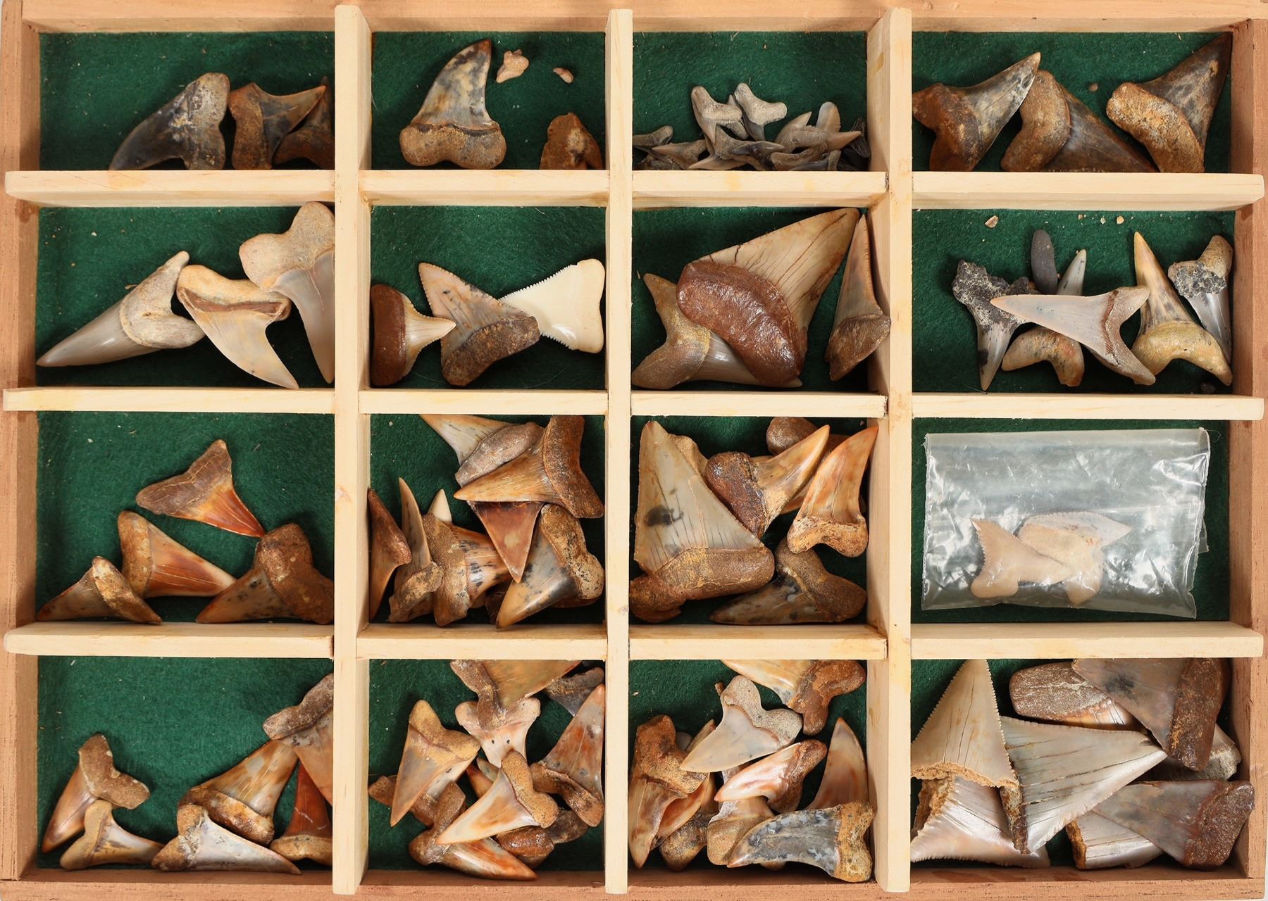 1) Fantastic collection of fossil shark teeth from Kern and Santa Barbara. 90+ teeth, a variety of sizes, from 0.25" to 2", housed in a nice wooden display box. 2) Fossil sand dollar from the Ojia Mountains, Ventura County, California. Approx. 3.5" diameter.