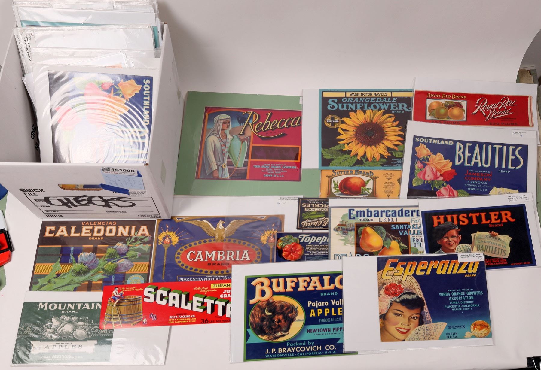 Choice dealer lot of California fruit labels. This group has a great variety of labels with nice art. Some examples include labels for pears, peaches, plums, oranges, apples, grapes, lemons, pineapples, etc. There are at least 100 pieces in this lot, if not more. Various sizes, the smallest is about 3.75 x 3.75, largest is about 14.75 x 13.75.