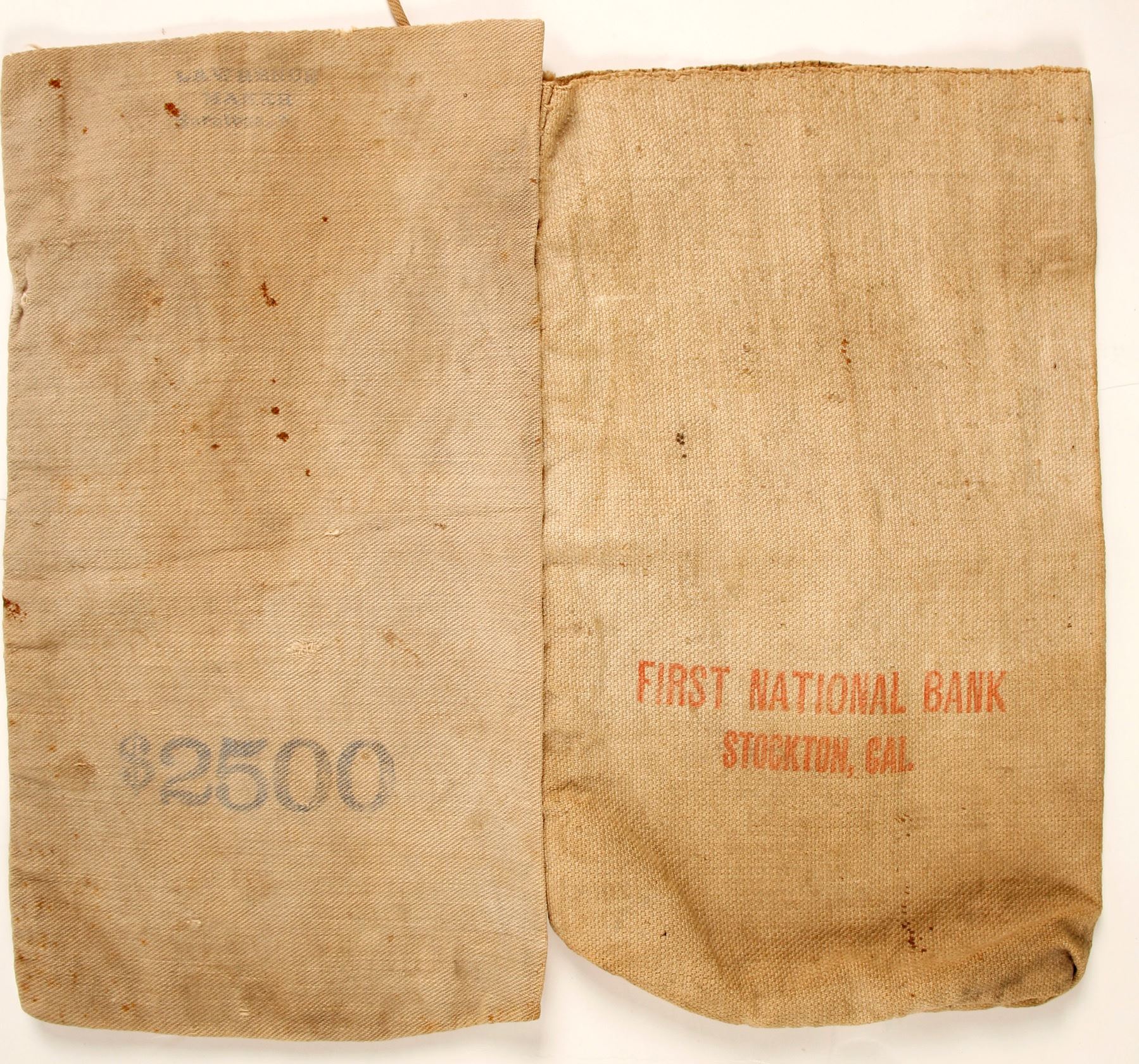 5 x 9" each. Stamped First National Bank of Stockton and $2500. Each held $2500 in gold. Date: c1920s City: State: California HWAC# 76068