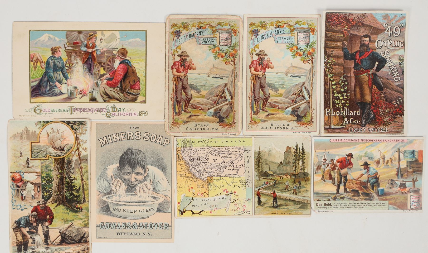 These are gold country trading cards printed in the 1880's depicting mining life in California. Several are printed by the Donaldson Bros. and numbered in a series of 50. All are in excellent condition. Meant for international distribution as several are printed in German. A total of eight cards. Please see photo for details.