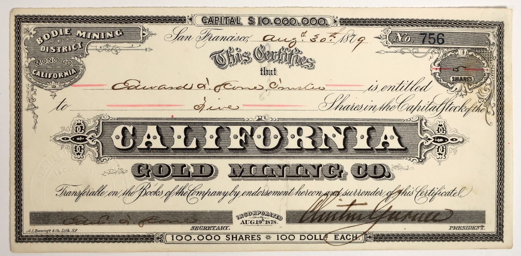 Rare. Incorporated in 1878. Cert. #56, issued to Edward F. Jones for 5 shares in 1879. Signed by Clinton Gurnee, president, and by Edward F. Jones, secretary. No vignette. Black border and print. Printer: A.L. Bancroft & Co., S.F. Uncancelled. 4 x 8.5." Clinton Gurnee was a pioneer attorney in San Francisco, who was associated with Wm. Chapman of the Chapman & Gurnee firm there. He was involved in certain large land deals in the San Joaquin Valley and other areas [Los Angeles Times, 25 October 1898). Born in the 1830s, he died intestate in October 1898 in San Francisco.