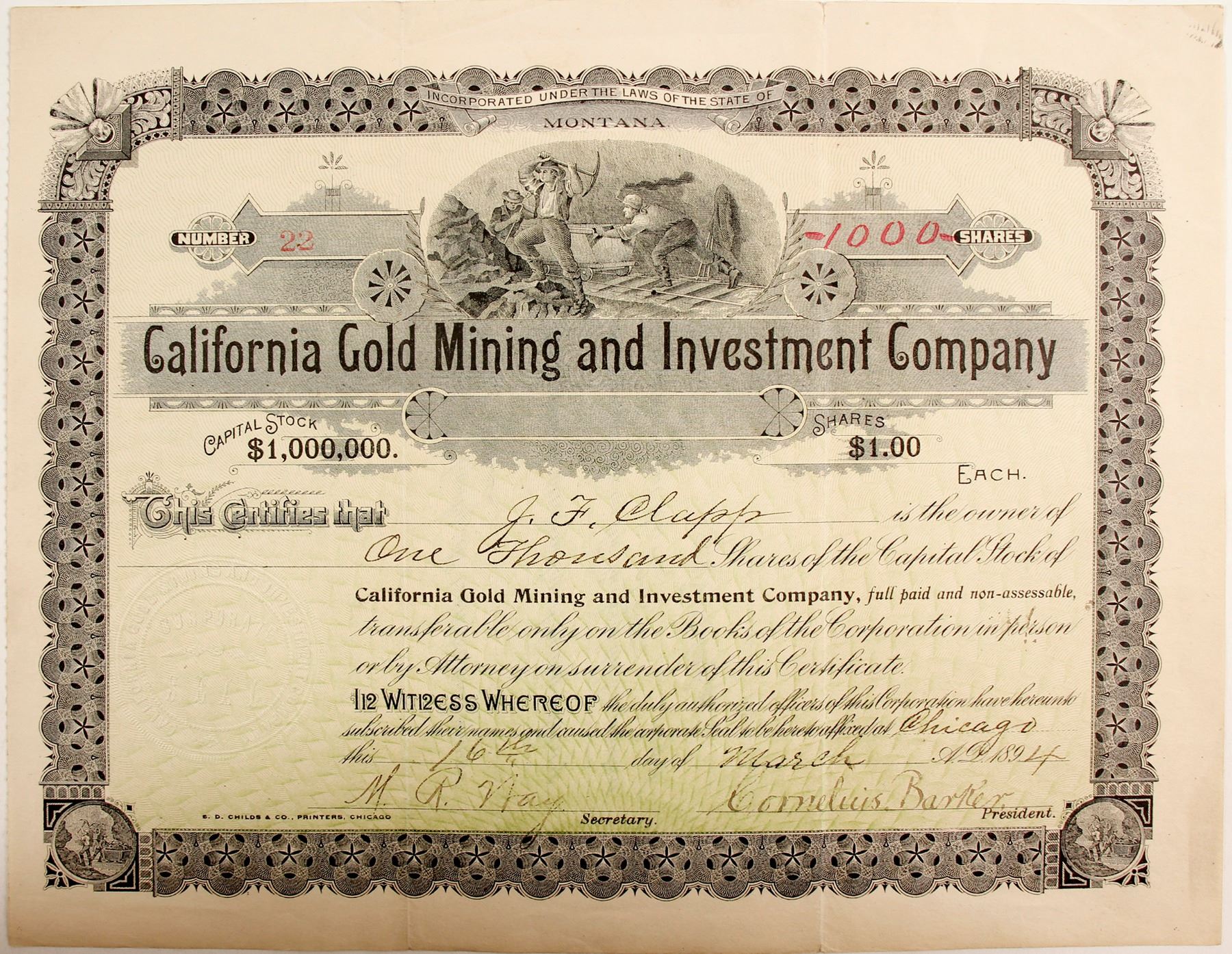 # 2 2 for 1000 shares to JF Calapp. SIgned by MR Way and president Cornelius Barker. Dateline Chicago 1894. Underground mining vignette with ore cart. Vignette is repeated in border scroll work twice. Childs & Co printers. Not cancelled. Corner fold upper right. Nicks at fold edgers. In 1896 the California Debris Commission received a request from the California Gold Mining and Investment Co., with their claim, near Taylorville, to deposit tailings in Foreman Canyon [Mining and Scientific Press, 1896] A California court case did appear in our research where this company was sold at a sheriff's sale. [Sacramento Daily Union, December 8, 1898] Prag Collection