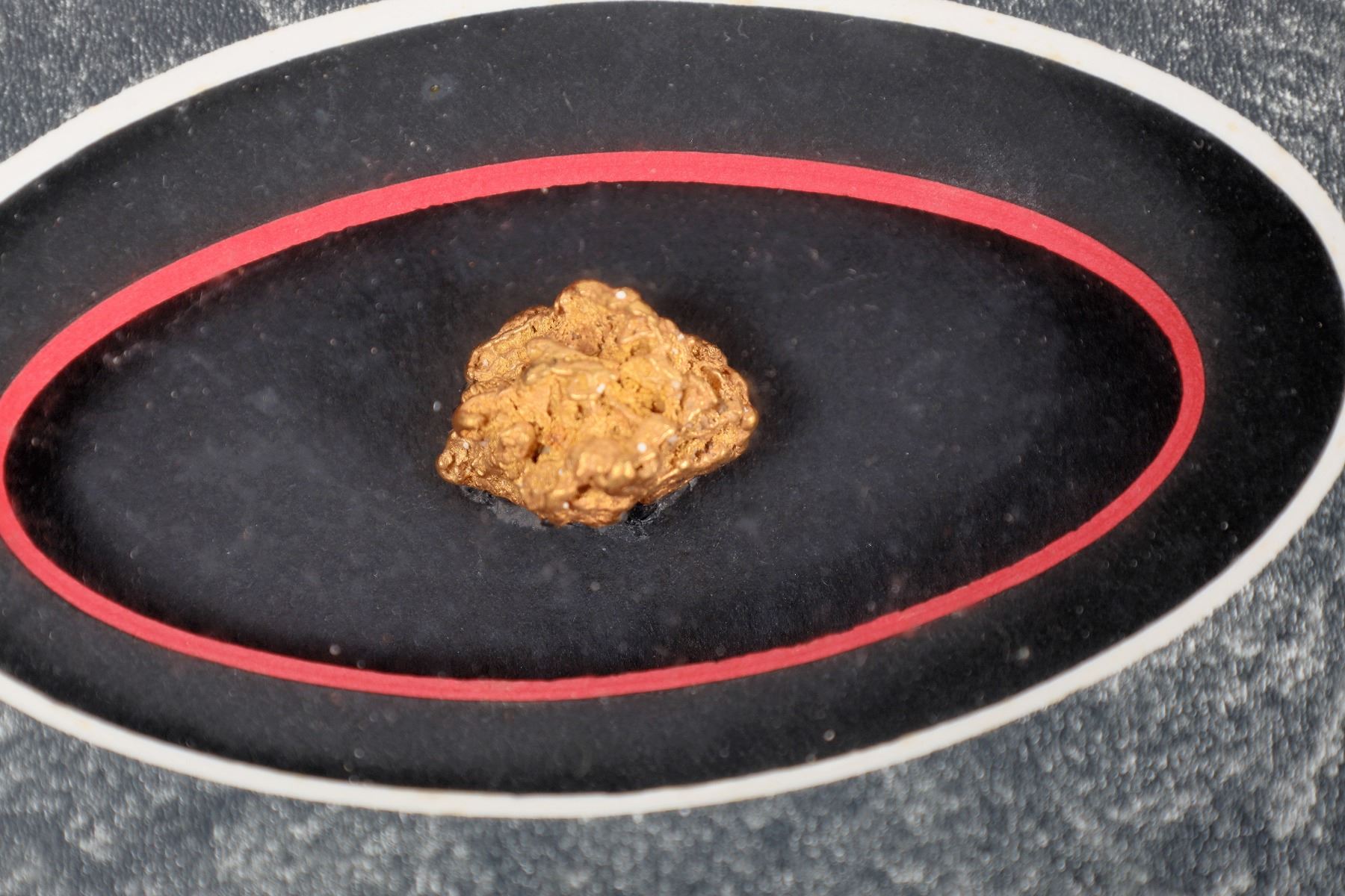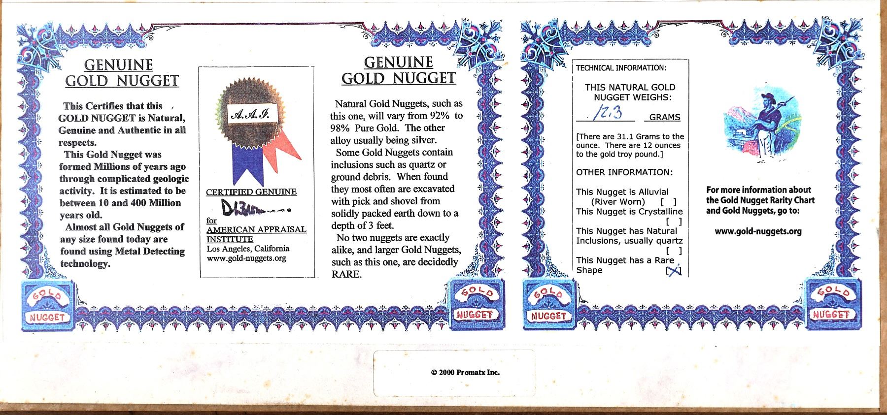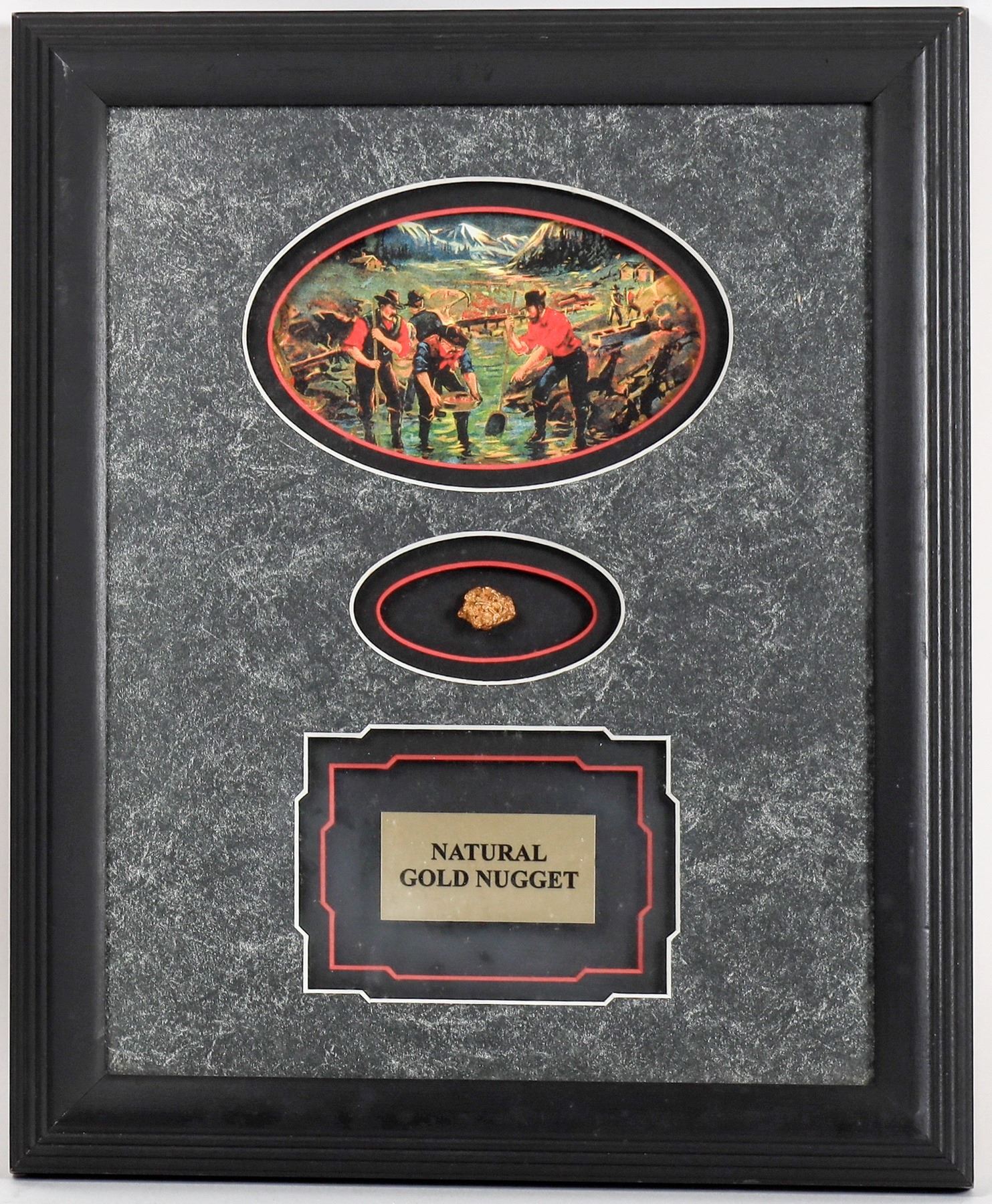 California Gold Rush genuine gold nugget. 12.3 grams. Certified genuine by American Appraisal Institute; signed certificate is adhered to reverse of frame. This nugget has a rare shape. Frame measures approximately 13" x 16". Double matted, 3D presentation features gold nugget at center (nugget is approx. 1" x .75"), California mining scene with gold panners and mountain backdrop on top and gold foil label at bottom. Very attractive presentation piece. California