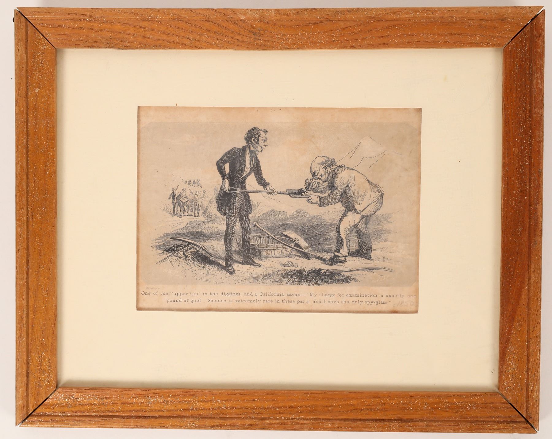 Framed c. 1850 California Gold Rush humorous print. "One of the "upper ten" in the diggings, and a California savan-"My charge for examination is exactly one pound of gold. Science is extremely rare in these parts, and I have the only spy glass." Print 4x5.25". California