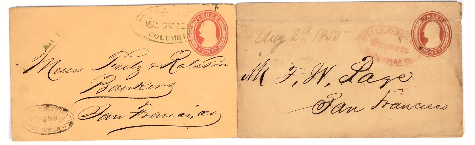 Lot of 2. 1) Aug. 2nd, 1855 cover to FW Page (of Page & Bacon in San Francisco). Red oval Wells Fargo express Sacramento cancel over red three cent postage. 2) Cover sent from WO Sleeper & Co., Bankers, in Columbia to Fretz & Ralston, Bankers, in San Francisco. Blue oval Wells Fargo Columbia cancel and black oval stamp for Sleeper. Date not readable, but others like it we've sold were from 1853. Ralston is WC Ralston, who would go on to form the Bank of California and be a major player on the Comstock in Nevada. Sleeper took over this Columbia branch from DO Mills.