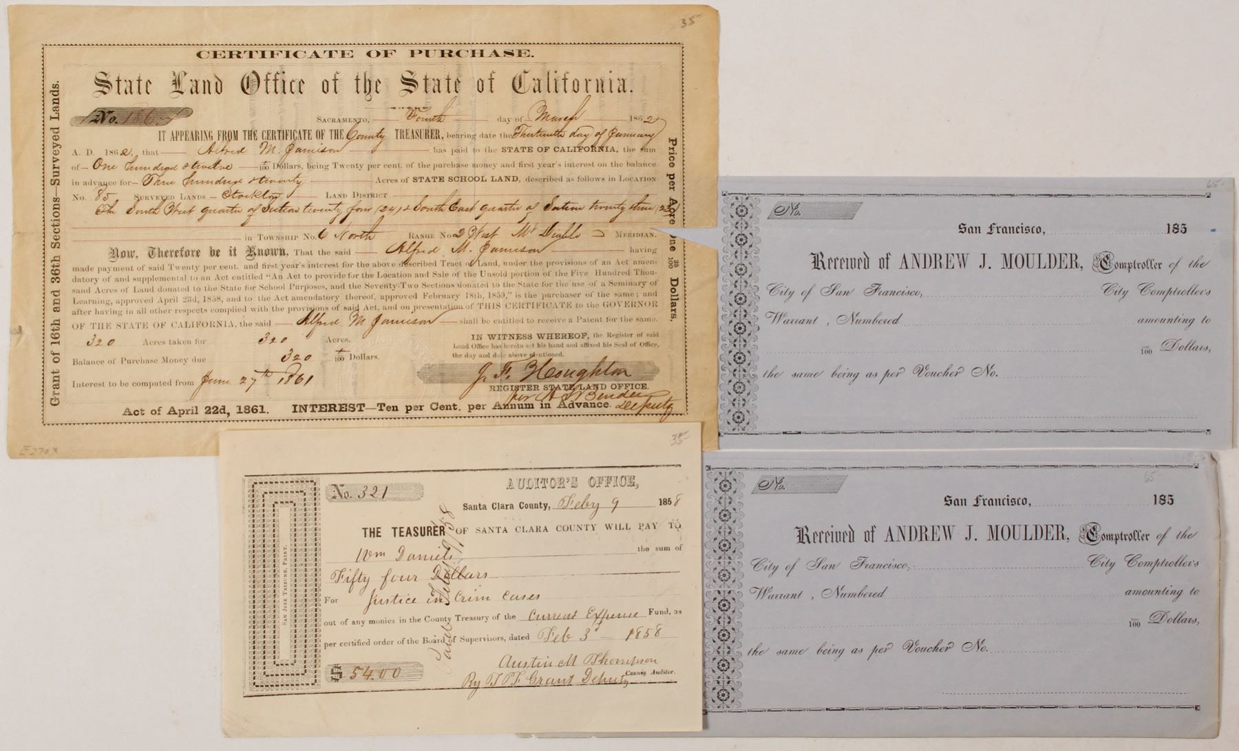 Lot of four. 1) 1858 treasurer's report from Santa Clara County, To William Daniel. 2) 1862 State Land Office to Alfred M Jamison for 20% down on 320 acres of STATE SCHOOL LAND. Stockton. 3-4) Unused 186- Alfred J Moulder San Francisco controller receipts.