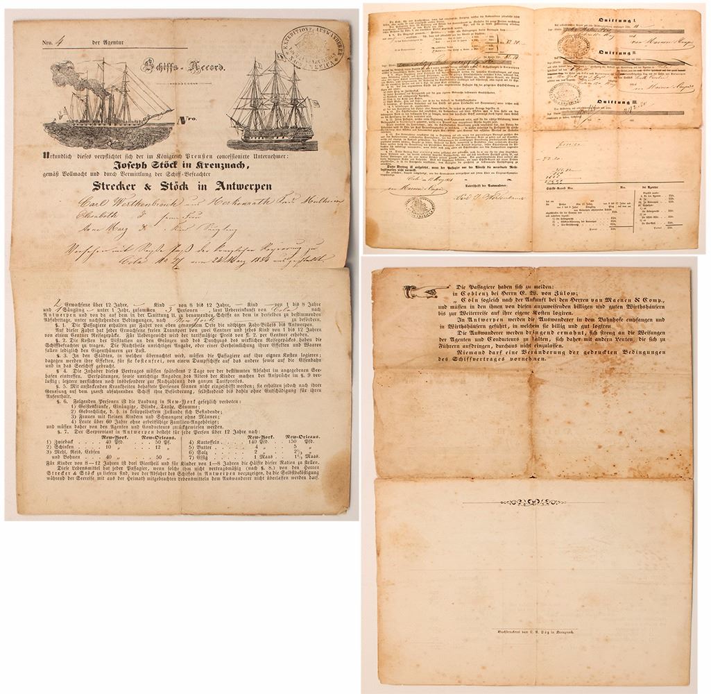 This is a German document from 1854 with two pictorial vignettes of early clipper ships bringing emigrants from Germany to North America. The document, written in German, is for an expedition from Germany that went to New York and New Orleans. The document involves five passengers led by Carl T Werthenbroich. The ship arrived in New York on 5 April 1854, under Captain Seward. This is an unusual document originating in Germany for immigrants to America during the Gold Rush. State: California City: Date: FHWAC#: 43653