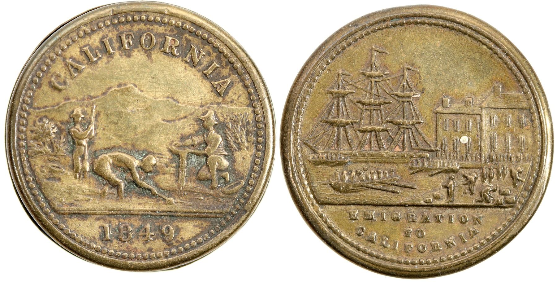 Tiny metal box (23 mm): California / (pictorial miners) / 1849 // (pictorial harbor scene) / Emigration / To / California. Size of a five dollar gold piece counter, unique!