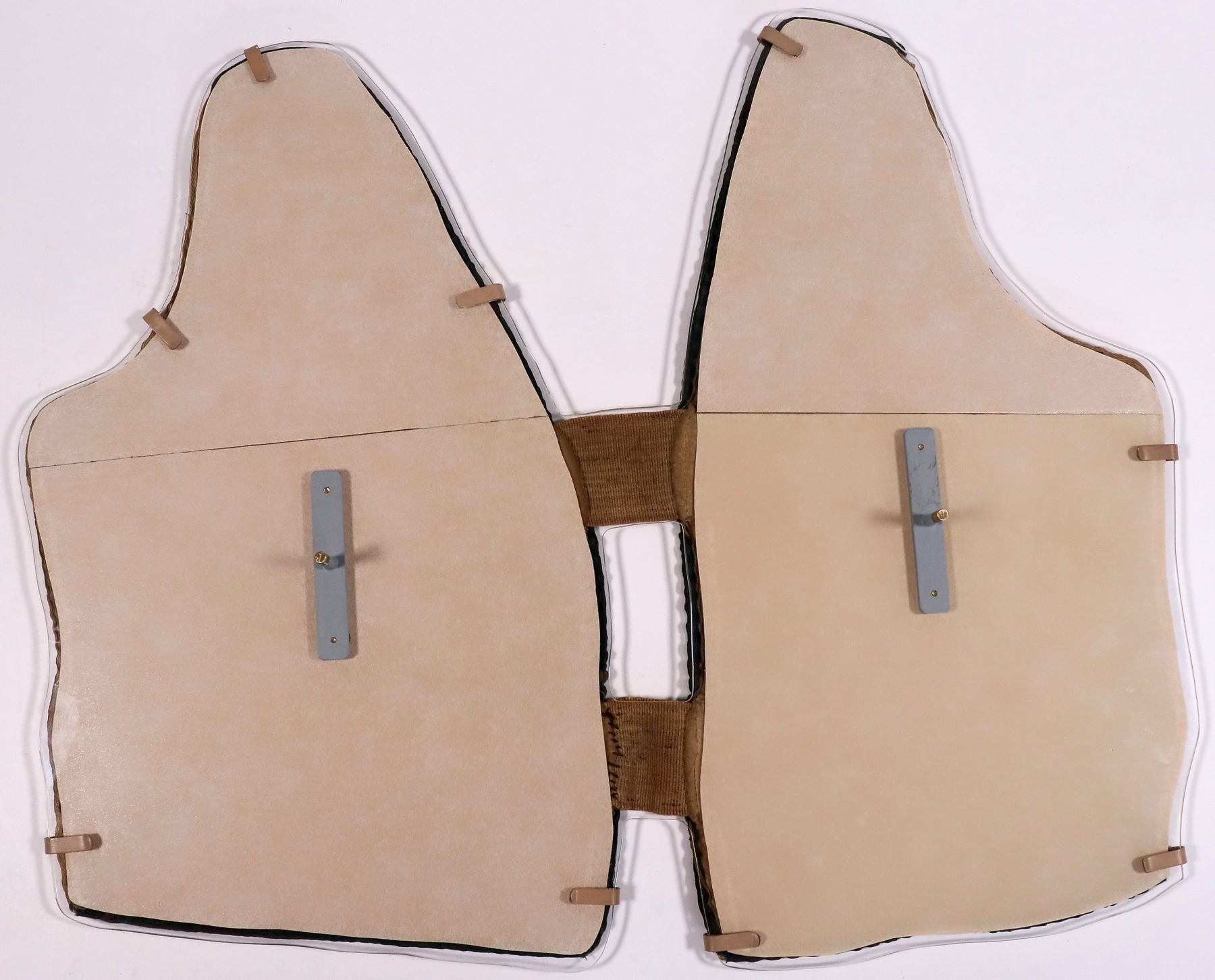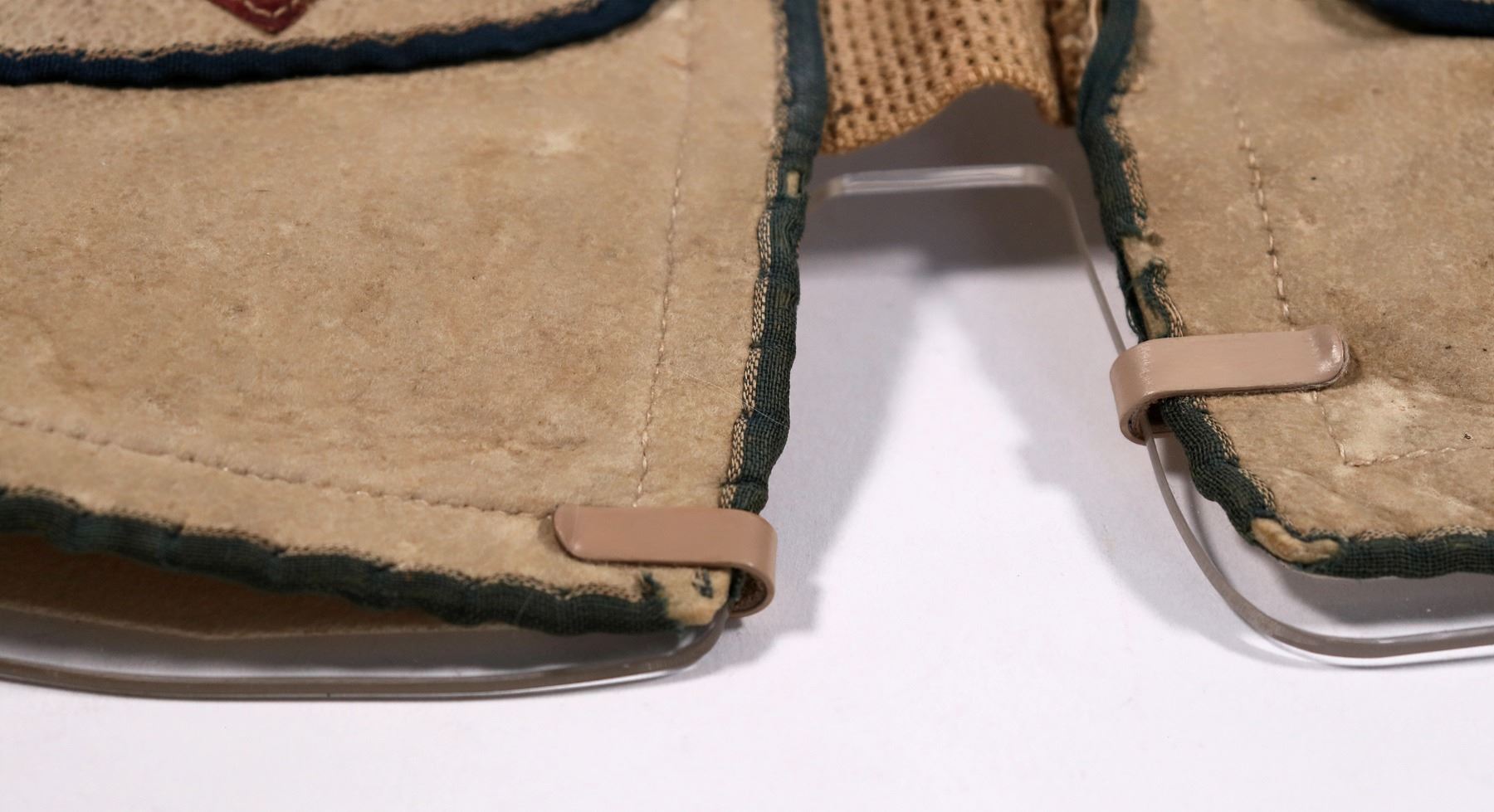 Ornate small leather money vest intended to hold gold coin and be worn under clothing. 2 identical side by side panels 15.5" x 8.5" attached at the center with a 2" wide stretch bands. At the shoulders were clips (classic California Gold Rush Style) for straps that went over the shoulders, under the arms, and reattached on the front of the vest below the armpits. The nature of the construction of this vest is such that my opinion (F. Holabird) is it was worn on the back because the straps would be invisible under a coat or shirt, and the vest itself would be completely invisible. At least 2 other vests of similar construction have surfaced in the last 2 decades at the Grass Valley Gold Rush Show. This vest is missing the shoulder straps and has been professionally mounted on custom plexiglass. It contains 3 flaps per side and a total of 5 pockets on each side with a button attachment above each pocket and reinforced leather holes.