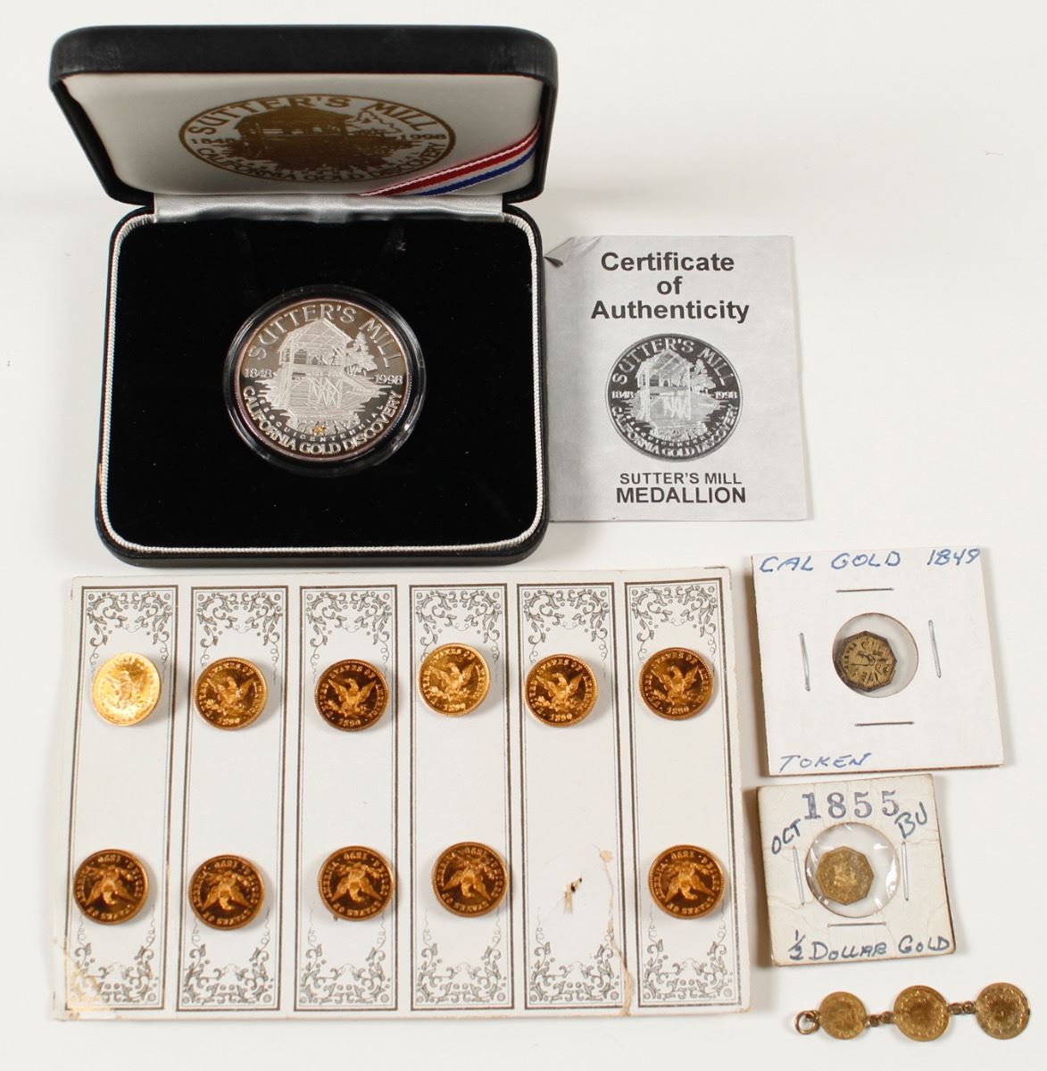Lot contains: 11 coin pins, 3 tiny 1855 gold rush coins, 1 1849 cal gold, 1855 1/2 dollar gold, and Sutter's Mill Centennial 1848-1998 1 troy ounce .999 fine silver. City: State: Token, Date: Inventory# 38225