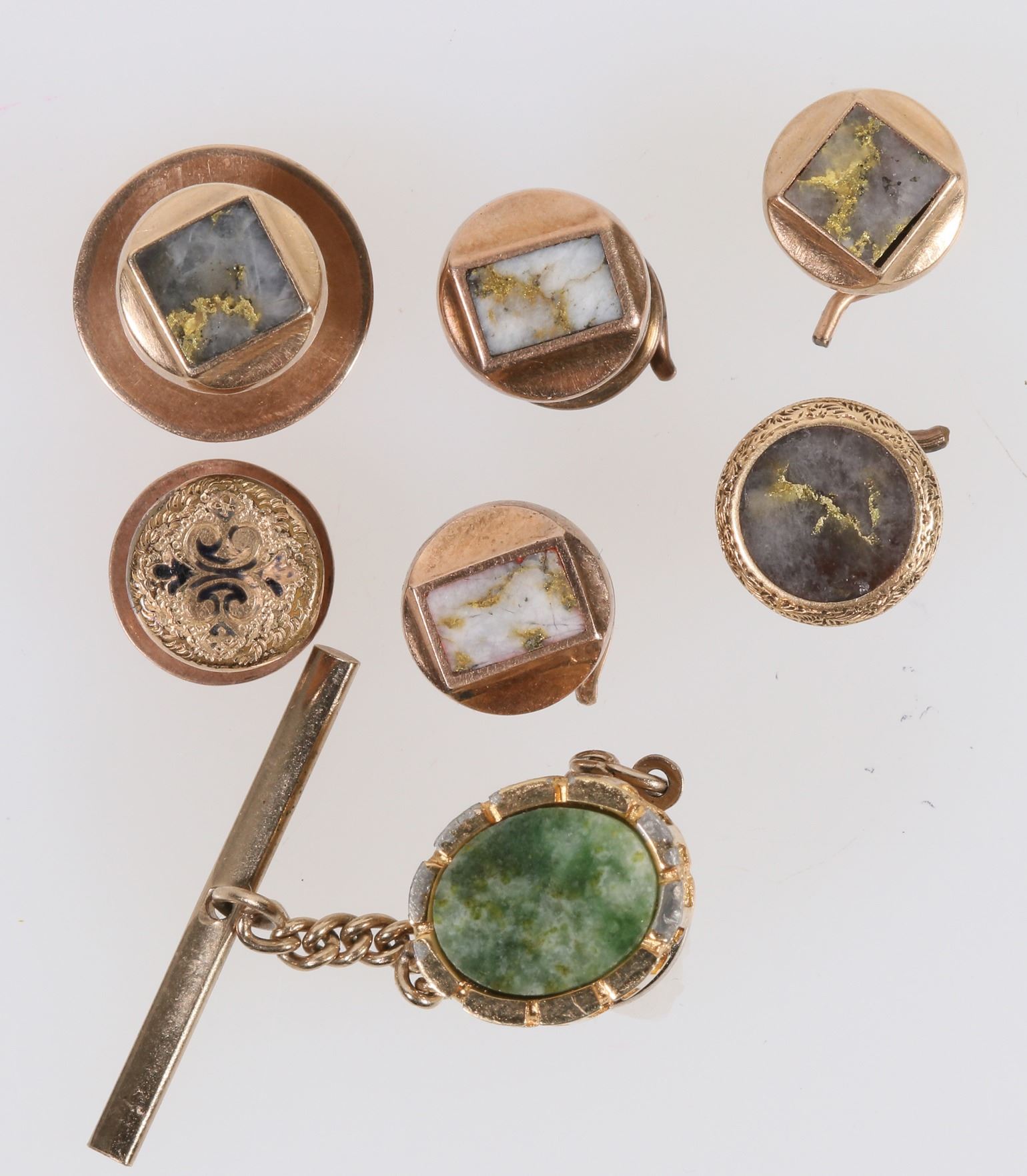 The pieces in this lot include 2 matching gold in white quartz coil studs, 2 gold in quartz mismatched coil studs, one gold in quartz small square cufflink, and one fancy engraved, small round gold cufflink. Also included is larger oval green stone lapel pin set in gold with chain and button link. These are custom made pieces between 1890-1920 period with Comstock provenance, likely worn by famous Virginia City/Reno proprietor, Al Schnitzer. Consignor of these pieces is the great grandson of Schnitzer. Total weight is 13 grams. Pieces of gold jewelry in this group tested 10k.