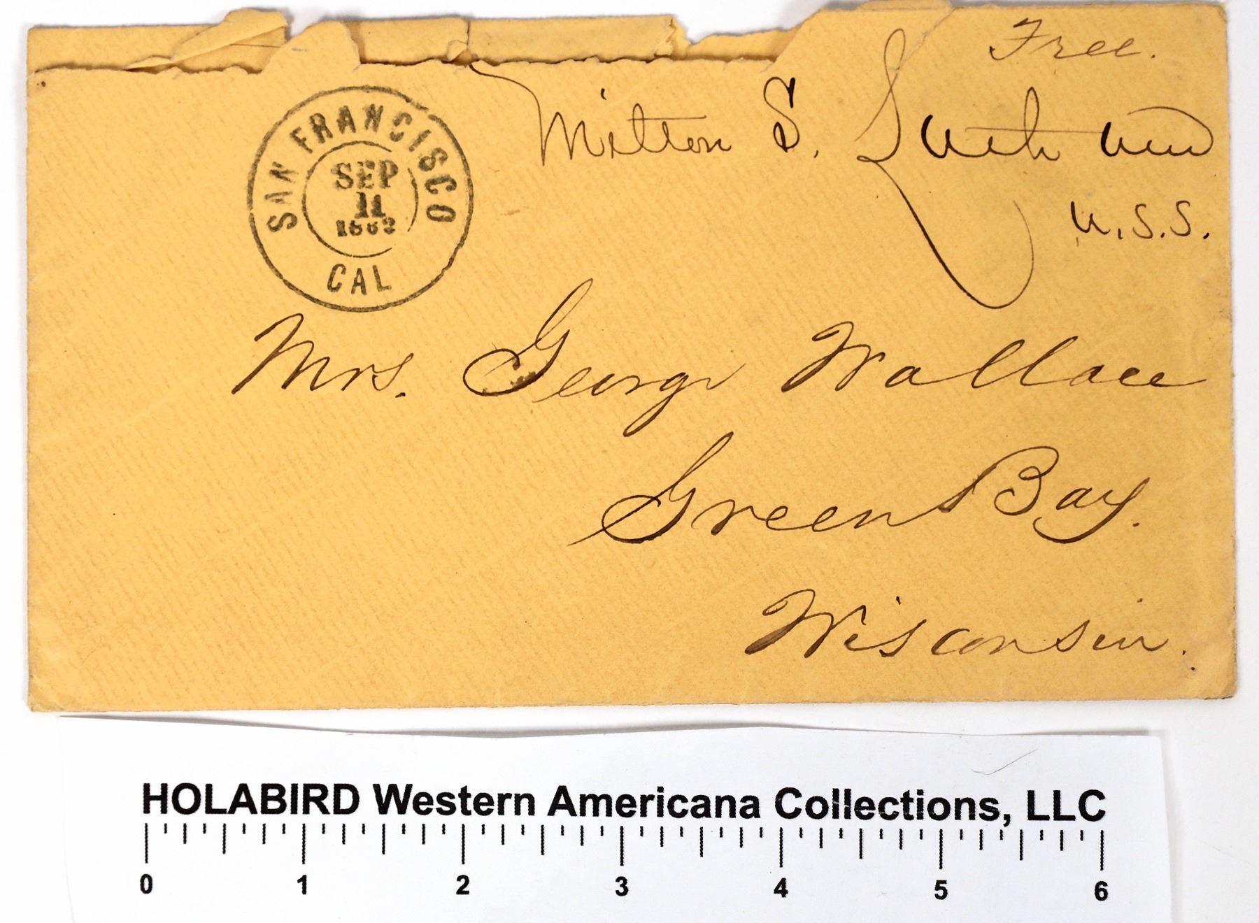 Cover sent September 1862 to Mrs. George Wallace in Green Bay, Wisconsin. Sent "Free" from Milton S. Latham, U.S.S. (which stands for United States Senator). This autograph is from Latham when he served as a US Senator for California 1860-63. He was inaugurated on January 9, 1860 as the 6th governor of California. However, less than a week into his term, he expressed to the State Assembly & Senate his desire to fill a Senate vacancy left by Henry P. Haun. He resigned as governor and was elected as a Senator, thus becoming the shortest-termed governor in California history at just 5 days in office. He lost re-election in the Senate and traveled to Europe, joining the London and San Francisco Bank Ltd, where he became the bank's San Francisco chief. Throughout the late 1860s and into the 1870s, he helped finance the California Pacific and the North Pacific Coast Railroad, earning recognition as one of California's rail barons. California 1862