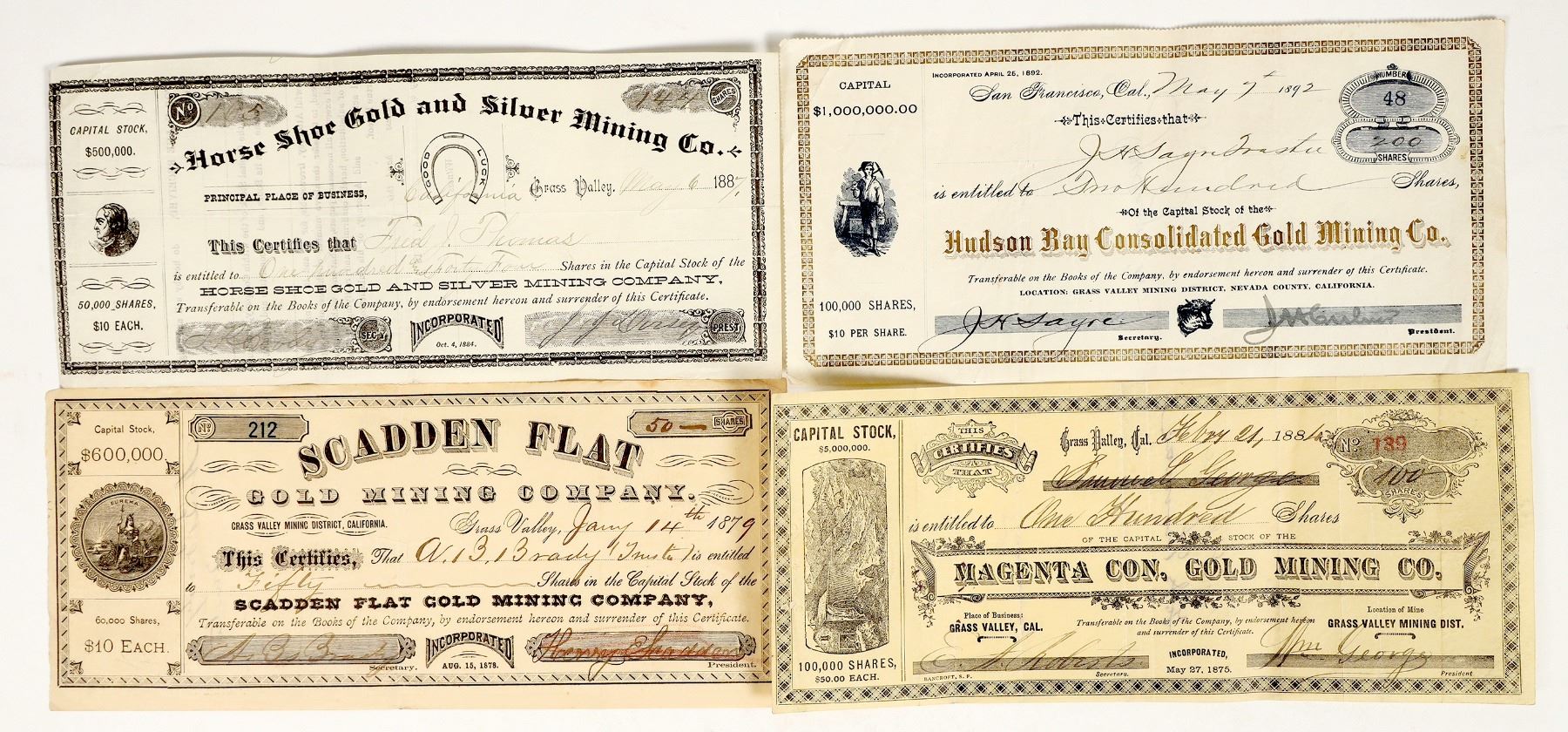 Lot of 4. I/U. 1. Magenta Con. Gold Mining Co., Issued 1884, vignette left side water wheel house. Bancroft printer. 2. Horse Shoe Gold And Silver Mining Co. issued 1887,Inc. in Colorado. Floral vignette makes up the left border. Also a state seal vignette at center. Printed by A. Gast & Co., 3. Scadden Flat Gold Mining Co. issued 1879 Allegorical vignette. Inc Henry Scadden discovered gold here in 1860. 4. Hudson Bay Consolidated Gold Mining Co. , issued 1892, vignette left side miner w/pick, bottom center bull. Unk. printer.