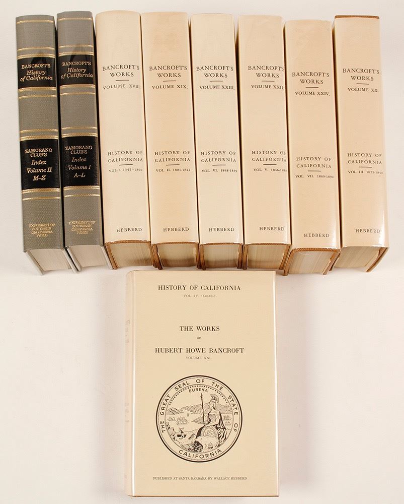 Extremely important set of Bancroft's works on the history of California, in seven volumes, 1542 to 1890. This seven volume set is the 1963 reprint with original dust jackets and protective plastic covers. It also comes with the Zambrano club index of these seven volumes prepared at a later date in two volumes. This is quite simply the most important work on California history you can get and comes with the index to boot. If you don't have this in your library it's a must and rare. (Potter Collection) Date: Location: California HWAC# 58974