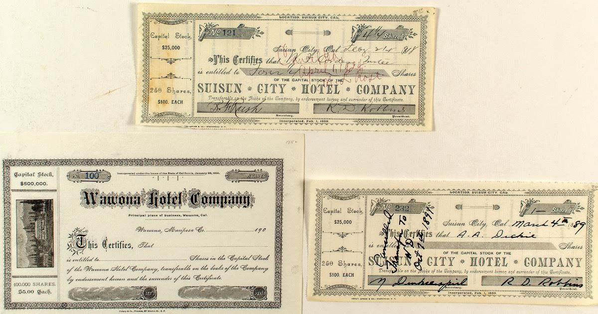 Lot of three, two different. 1) Suisun City Hotel Company. Two issued stocks 1889 and 1918, both pen cancelled. 4" x 9.75" RD Robbins came to California in 1860 where he found work as a day laborer in Suisun. In May 1862 he purchased a one-half interest in a Suisun lumber yard and eventually bought his partner’s interest. He would established the Bank of Suisun and served as its president until his death in 1919. In 1876, Jacob and Moses Dinkelspiel built a General Store in Bird's Landings. The general store proved to be Bird's Landings most successful enterprise.2) Unissued Wawona Hotel Company. Mariposa County. 190-. Nice vignette of hotel. Printed by Cubery & Co., SF. 6.5" x 10" (Prag Collection) City: State: California Date: ID# 34510