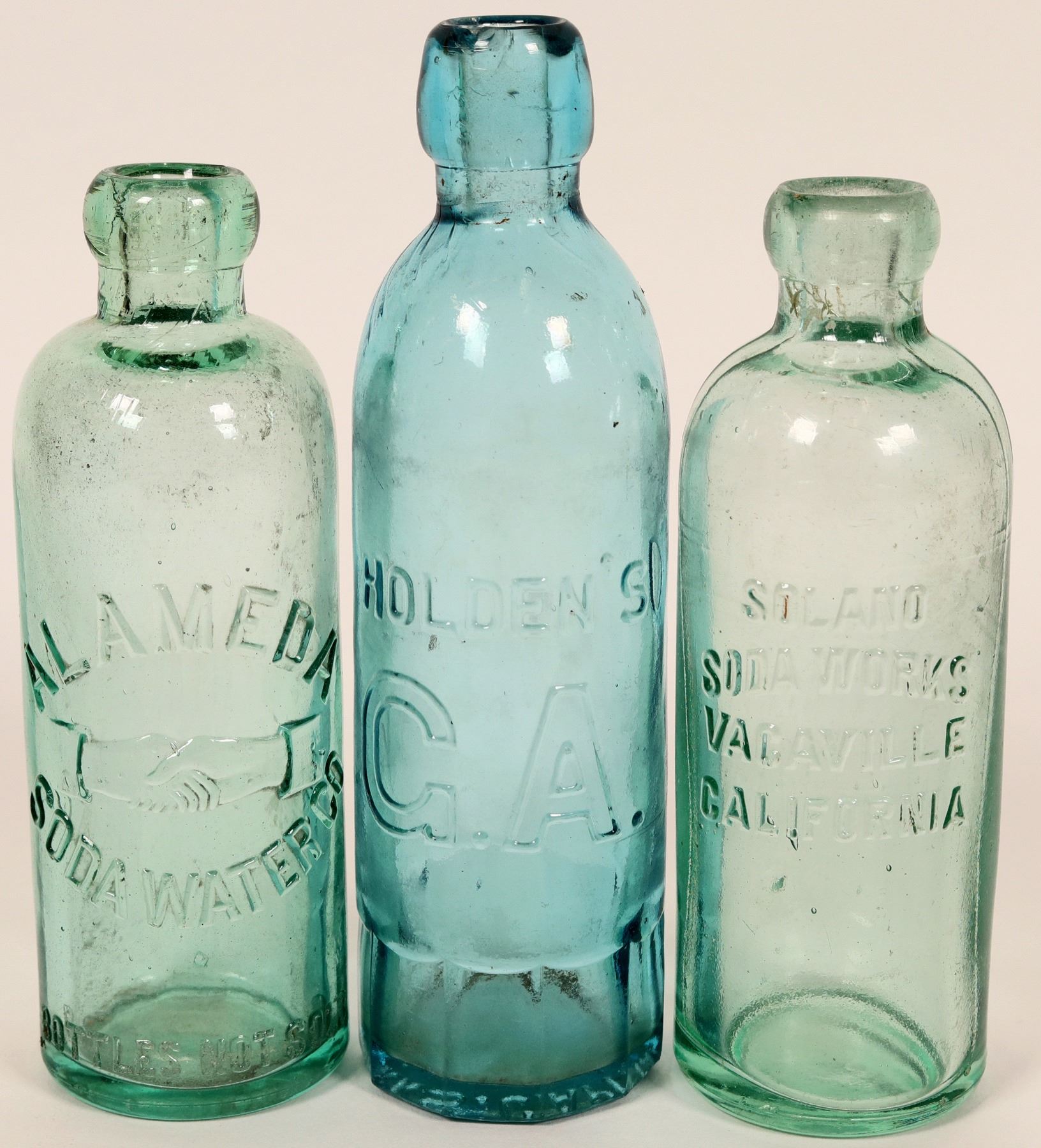 Three Hutches: Solano/ Soda Works/ Vacaville/ California. micro chip in top; Alameda/clasped hands/soda water, aqua; Holden/ G.A. (Sacramento) CApital soda works on bottom.