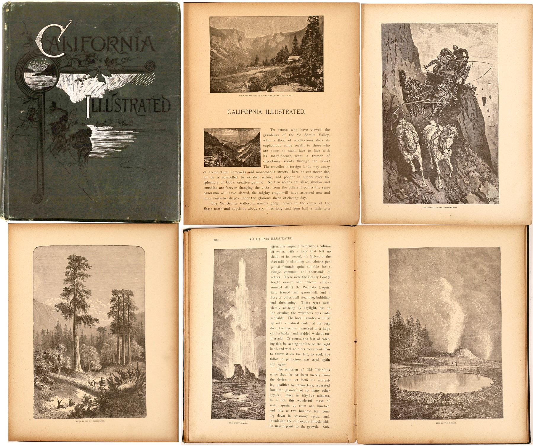 142 pages. Over 30 pages dedicated to Yellowstone alone. Also the important cities, Shasta, missions, giant trees, etc. Over 80 illustrations. Several are full page! Damage to spine, but still tight.