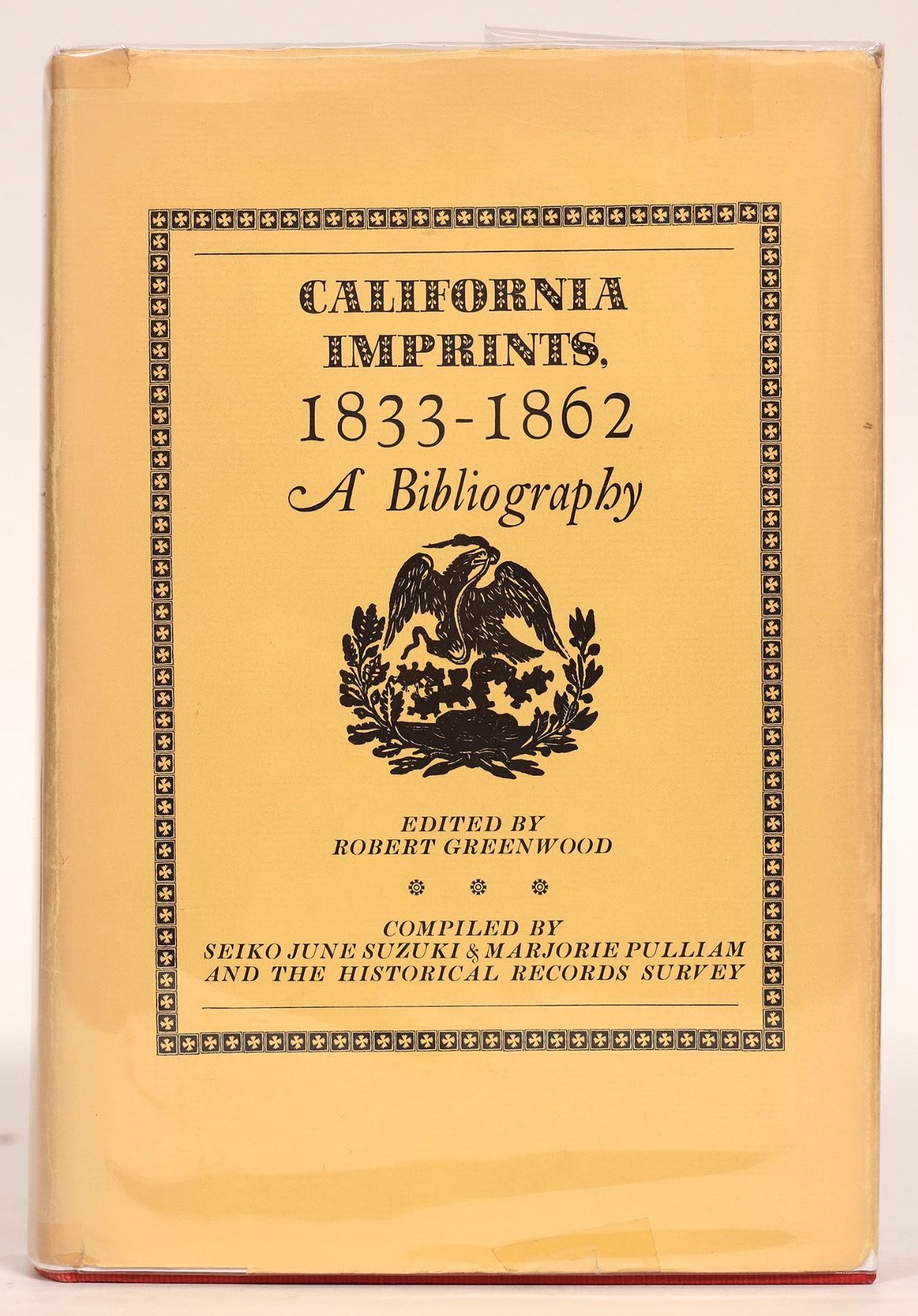 California Imprints, 1833-1862, A Bibliography. Robert Greenwood, editor. 1961, limited edition, 750 copies, Talisman Press, Los Gatos, CA. A bibliography of books covering the State of California in that time period. 524 pp. 9.5" x 6.5". Dust jacket with minor rips, covered in plastic. Book, fine. California