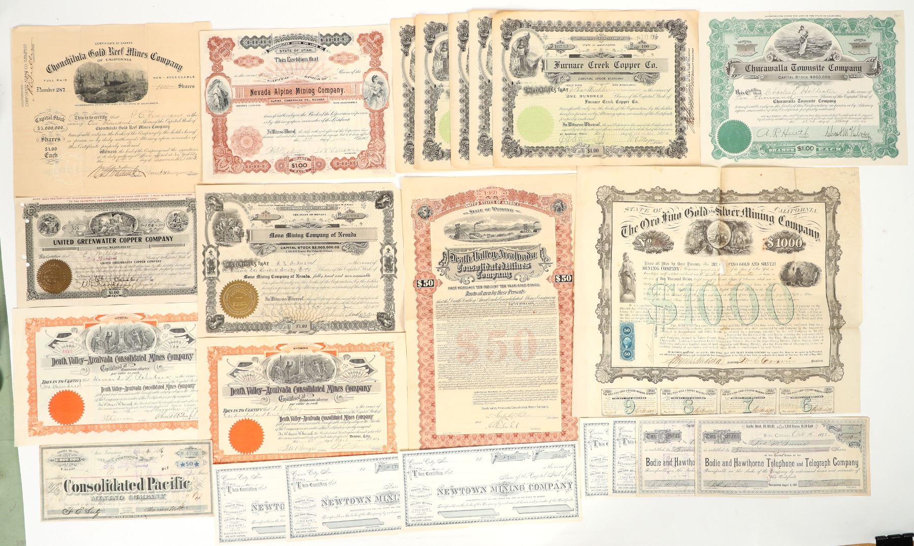 Lot of 24. U/U, I/U, I/C. Issued 1865-1920. Conditions VG-EF. I.E.; Consolidated Pacific Mining Co., Bodie and Hawthorne Telephone and Telegraph CO., Nevada Alpine Mining Co. , Furnace Creek Copper Co., Death Valley-Arcalvada Consolidated Mines Co.-$10 bond, The Oro Fino Gold and Silver Mining Co. $1000 bond/50c revenue stamp.