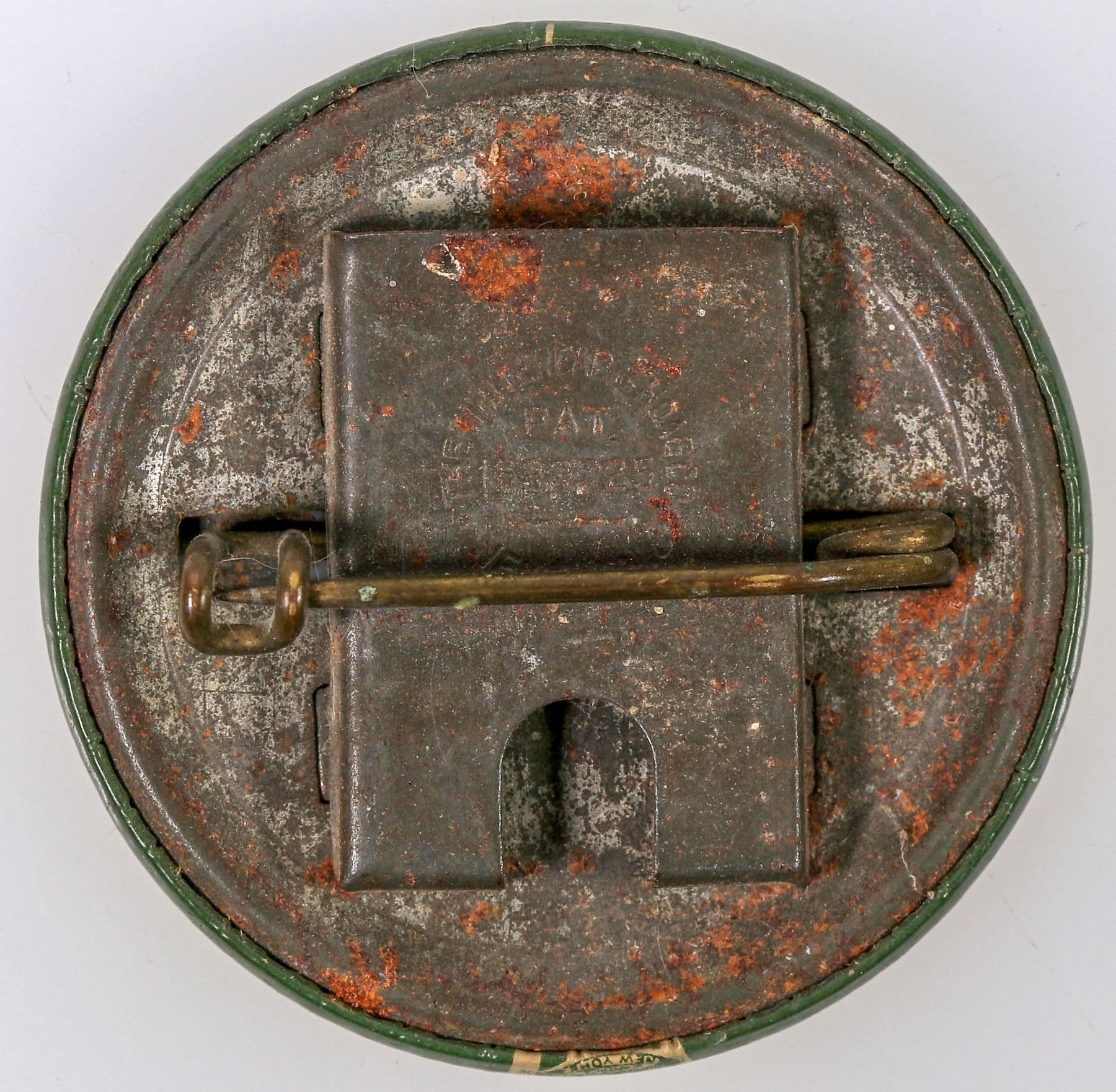 This pinback from California is rare. Rare enough to send a young hunter in the field when money was tight. This could be called subsistence hunting; and a lifetime of enjoyment. 1.75 in. in diameter. In very good condition.