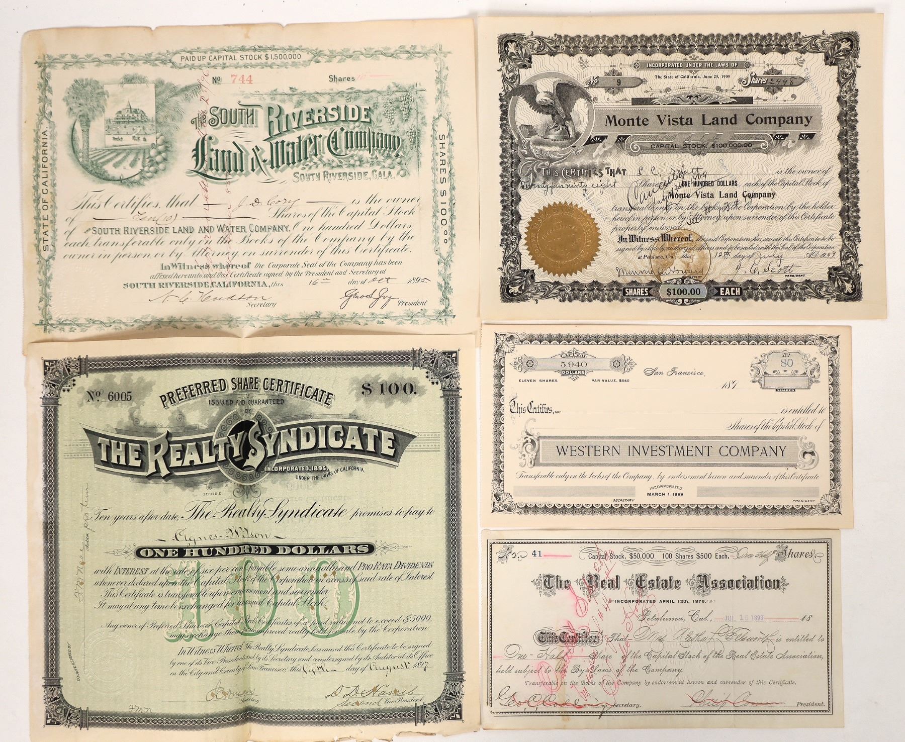 Stocks certs include Western Investment Company, Monte Vista Land Company, South Riverside Land & Water Company, The Real Estate Association and The Realty Syndicate. A are issued and cancelled. Please see photos for more details.