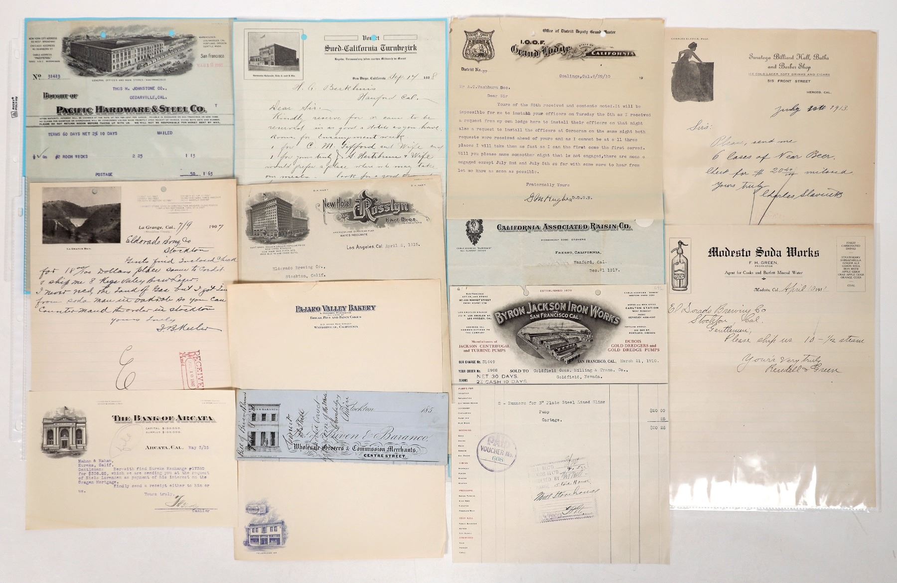 California letterheads include The Saratoga Billiard Hall & Baths, The Modesto Soda Works, California Associated Raisin Company, The Pajaro Valley Bakery and more. All in nice condition. Please see photos for more details.
