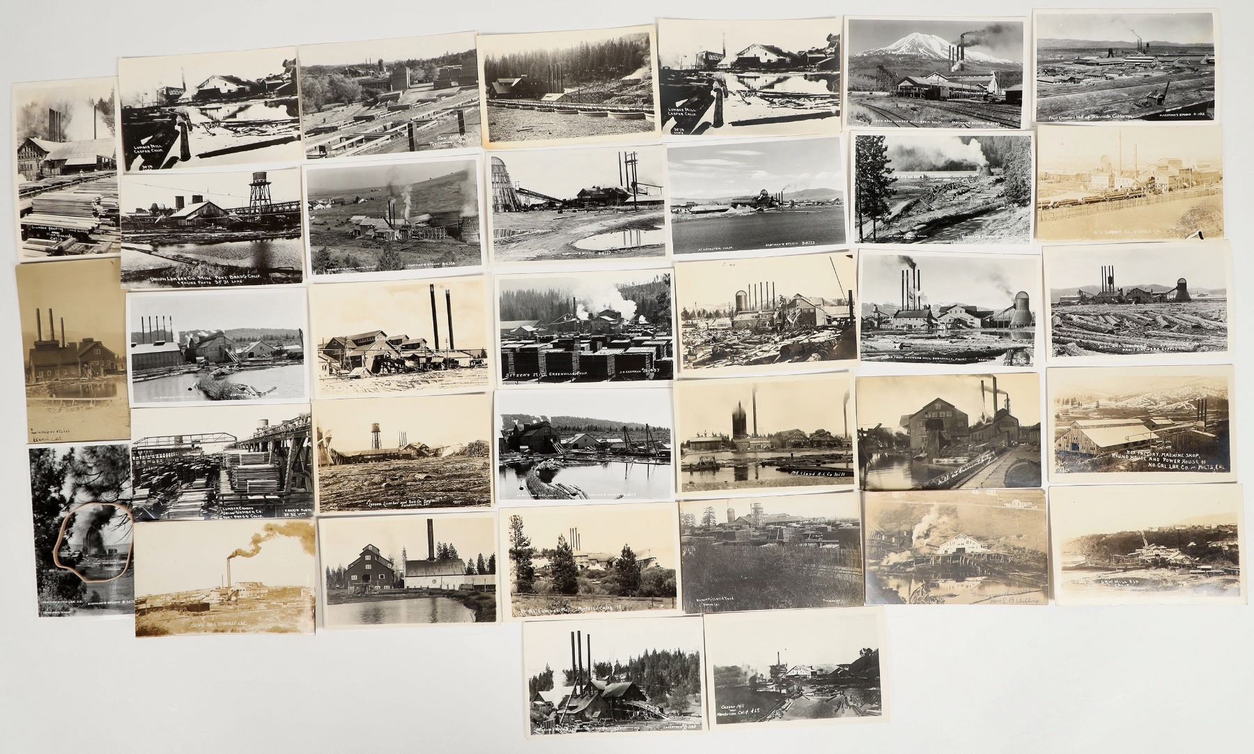 This is a lot of 35 postcards containing all real photos. These postcards present lumber mills from all over California. They date from 1920 to 1950.