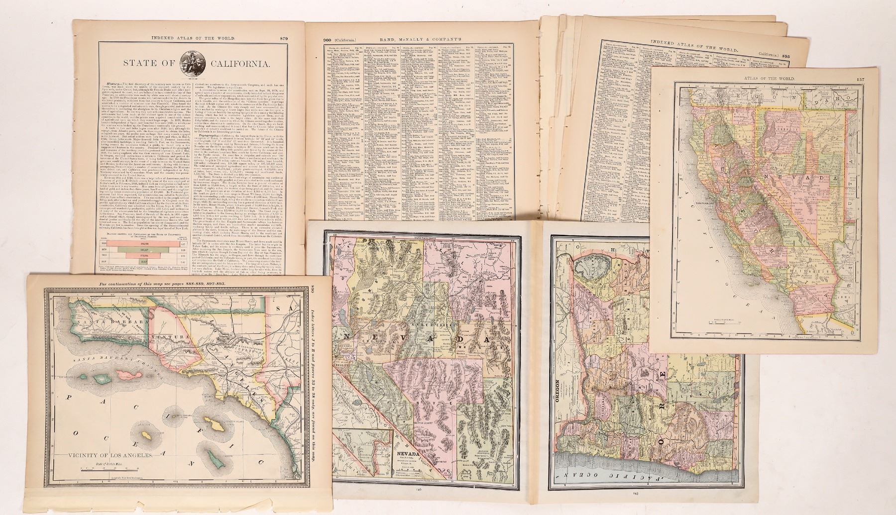 3 California maps. 1 is a California map by Cram c. 1879 with entire state, 23.5x13", lower right .7" tear. Rand McNally 2 part with Northern, Central and Southern California. 14.5x21.5". Rand McNally entire state with multipage index, 13.5x11".