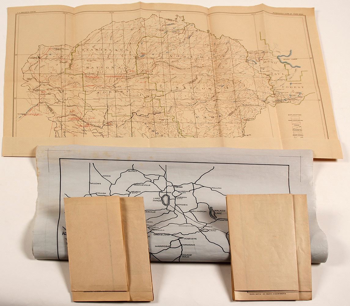 1) Map of Central California showing Principal Cities and Connecting Highways, includes Yosemite location. 1940 19.25" x 18". 2) Map of the Drainage Basins of Mokelumne, Stanislaus and Clavey River, Calif. USGS plate XXVII 17.5" x 17.75". 3) multicolor relief map of Calif. showing hydro-electric transmission systems, USGS page 493, plate 1 33" x 27.75" 4) Multicolor map of basins of Tuolumne and Merced Rivers showing hydro electric developments. USGS water supply paper 493 plate XXXIX 17" x 22" Date: Location: California HWAC# 56525