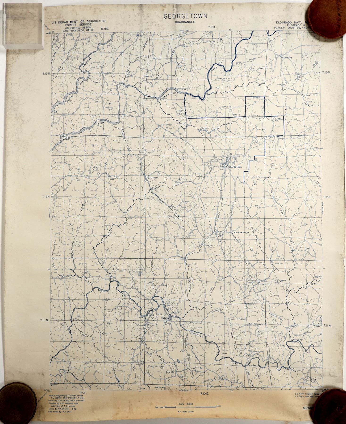 Lot of 3. 1) Lands Granted to the Southern Pacific Railroad Co. in California. Sheet No. 2, Nov. 9, 1907. Onion paper map shows forest reserves, county lines, and wagon and stage roads. Takes in portions of Merced, Madera, Fresno, King, Kern, San Benito, Monterey, San Luis Obispo counties. 41 x 58" 2) Map of San Bernardino County. Township and range also noted. Done on linen. 44 x 31" 3) El Dorado National Forest Map, in Placer and El Dorado Counties. Part of the Georgetown Quadrangle, 1945. Shows locations of many gold mines. 33 x 40"