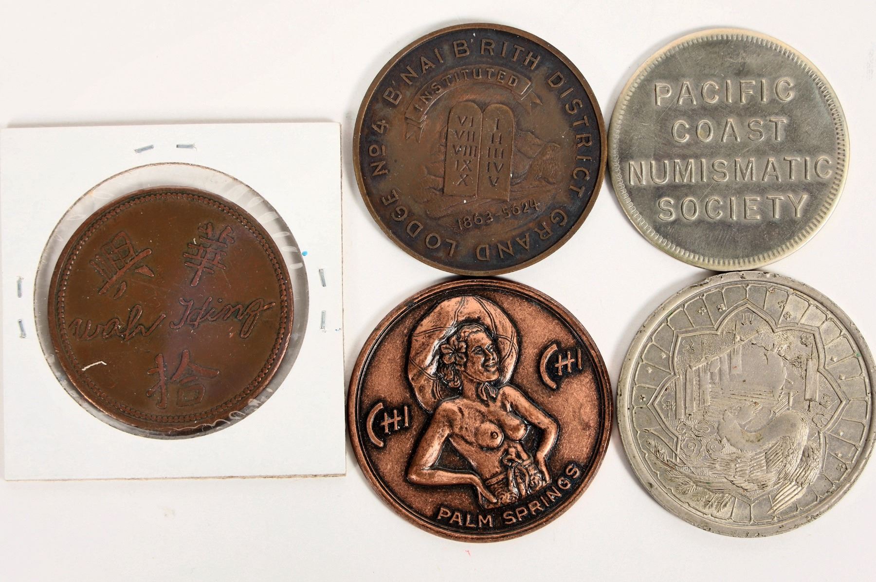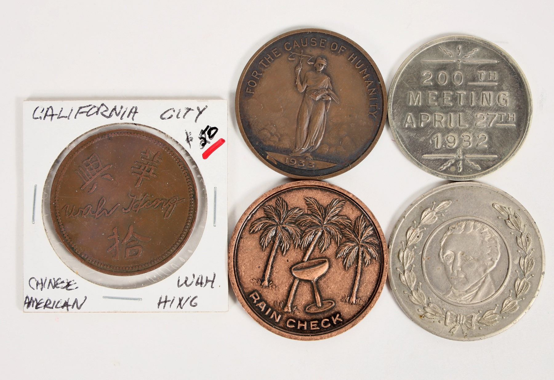 Lot of five medals: 1) Chi Chi Club Palm Springs; 2) Pacific Coast Numismatic Society 1932; 3) Wah Hing; 4) B'nai B'rith Lodge No. 4 San Francisco 1933; 5) Movie money prop coin 1951 "Sirocco" with Humphrey Bogart. Obv: President Monroe; Rev.: bird of paradise.
