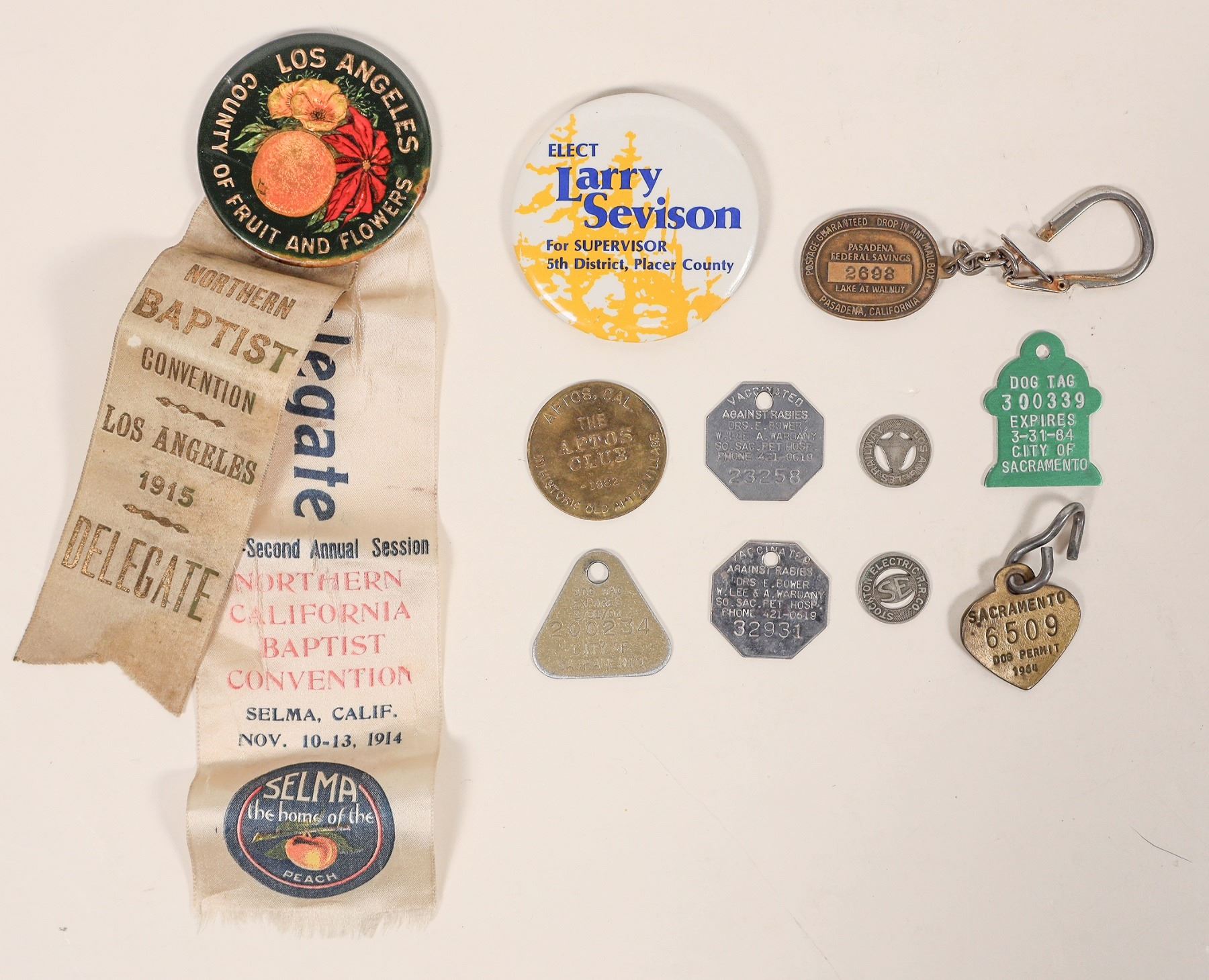 A dozen eclectic items: Los Angeles Count of Fruit and Flowers pinback with two ribbons:1915 Southern Baptist Convention and 1914 Northern California Baptist Convention. Elect Larry Sevison for Supervisor Placer County pinback; The Aptos Club drink token; Pasadena Federal Savings key chain; two transportation tokens: Los Angeles Railway & Stockton Electric R.R. Five dog tags: Sacramento: 1964, 1984, 1991, rabies vaccination tags (2).