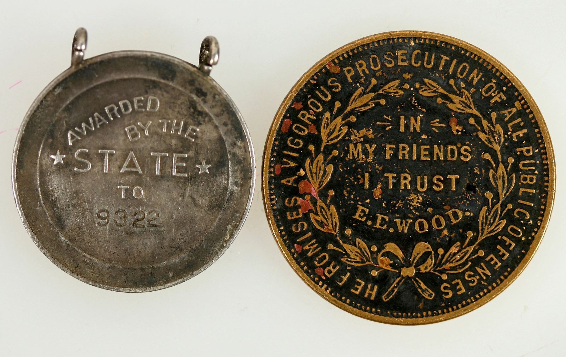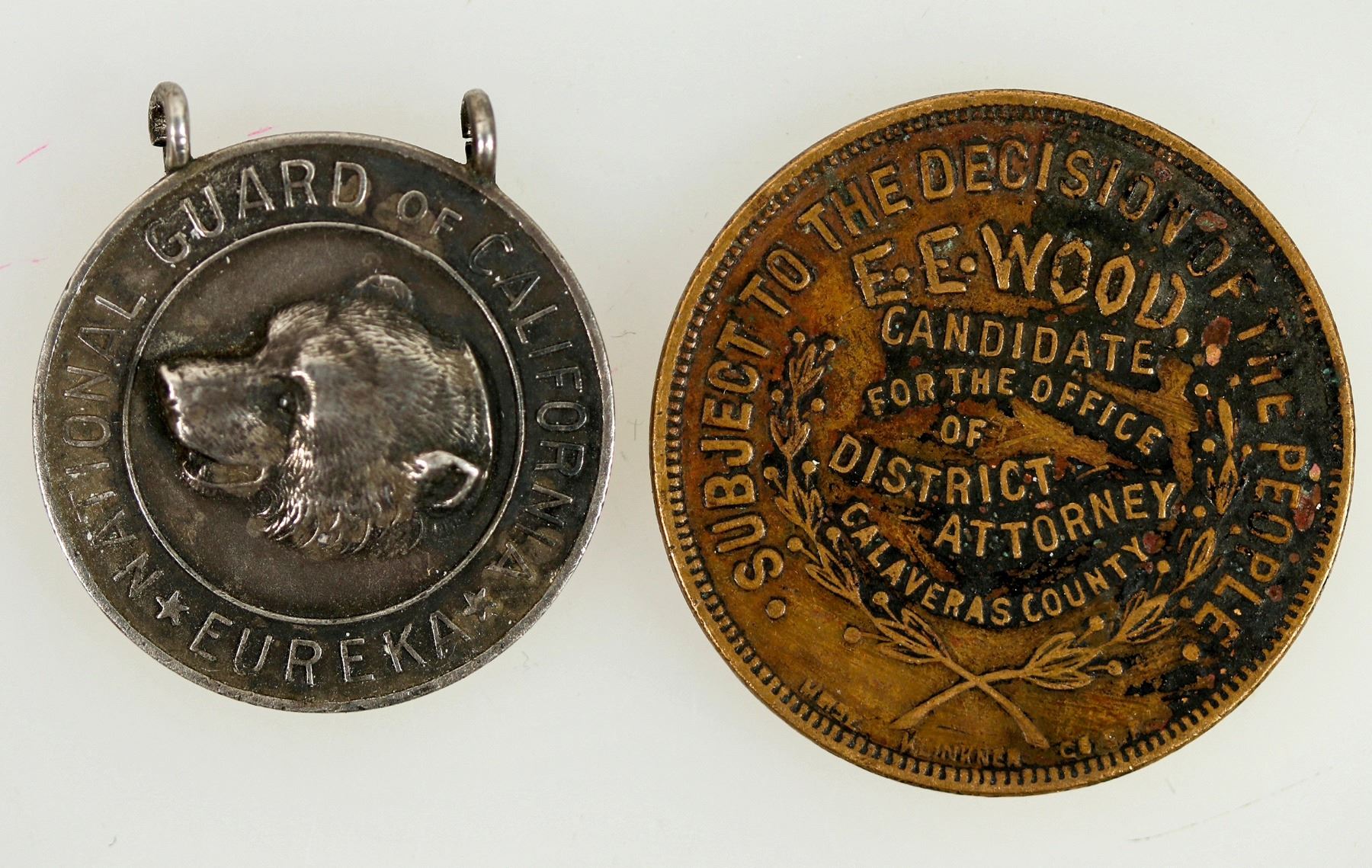 Two rare medals from California. First is a campaign medal (33mm diameter) for E.E. Wood. Obverse inside rim reads: // HE PROMISES A VIGOROUS PROSECUTION OF ALL PUBLIC OFFENSES //, and the center reads: // > IN < / MY FRIENDS / I TRUST / E.E.WOOD. //. The reverse inside rim reads: // SUBJECT TO THE DECISION OF THE PEOPLE //, and the center reads: // E.E.WOOD, / CANDIDATE / FOR THE OFFICE / OF / DISTRICT ATTORNEY / CALAVERAS COUNTY //. Second medal inside rim reads: // NATIONAL GUARD OF CALIFORNIA / EUREKA //, and has a moderate relief image of a bear head. reverse reads: // AWARDED / BY THE / * STATE * / TO 9322 //. There are two small loops attached perpendicular to the rim that would be used for hanging the medal.
