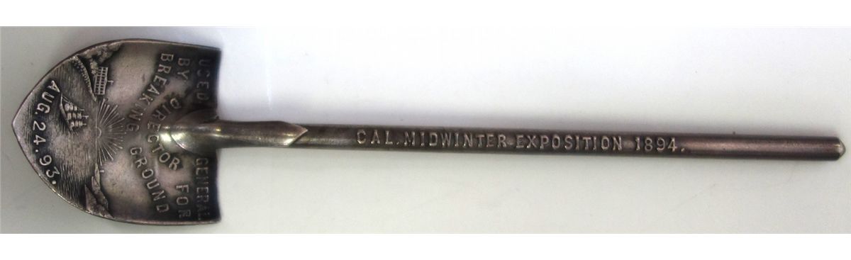 Small spoon in shape of shovel from the Prag collection. California Midwinter International Exposition 1895 on handle. "Used by Director General for Breaking Ground Aug. 24. 93." on obverse, "Agatha" engraved on reverse. Extra rare.