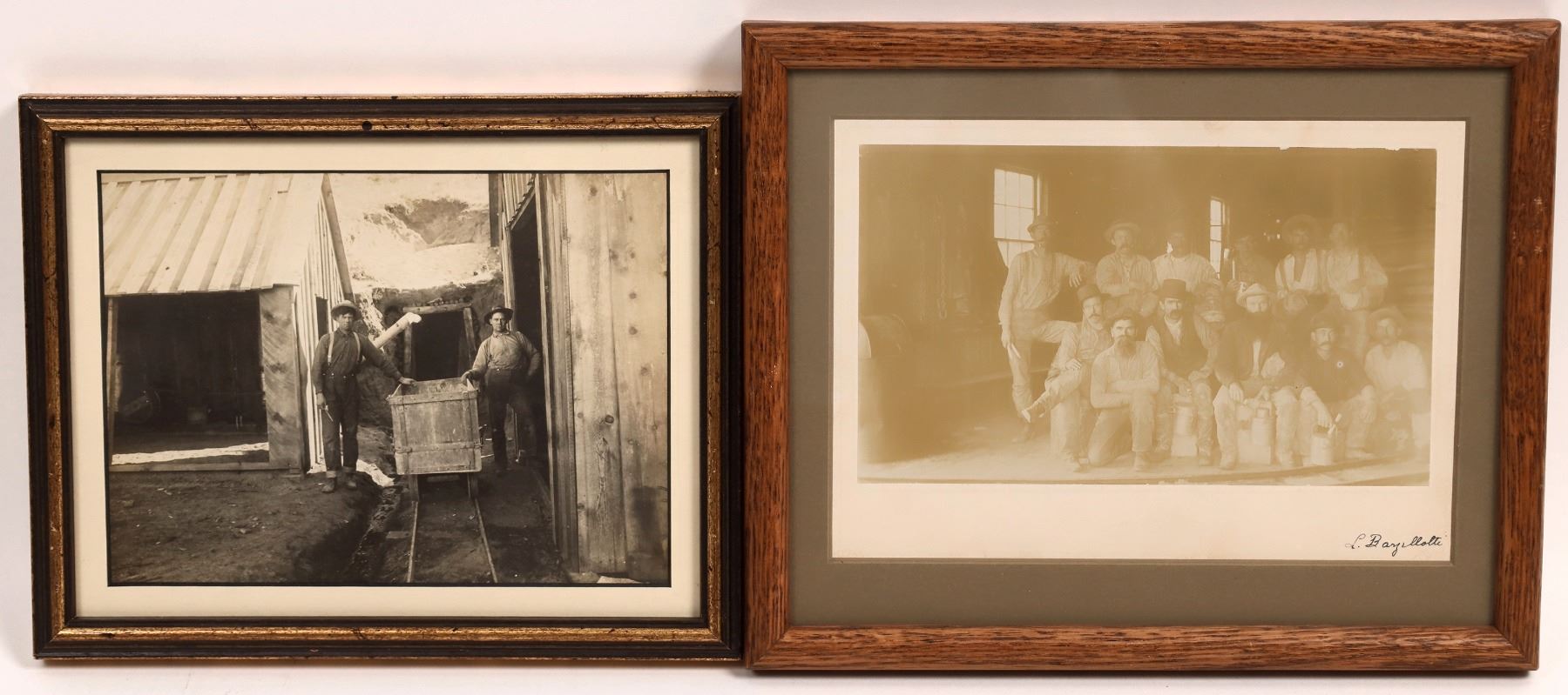 B) Photograph of a group of twelve miners posed inside of a building. The lower right corner of the photograph is signed "L. Bargillotti" [?]. Photograph is 7.75 x 4.5, matted and framed in an 11 x 9 wooden frame. Good condition, photograph is slightly faded.