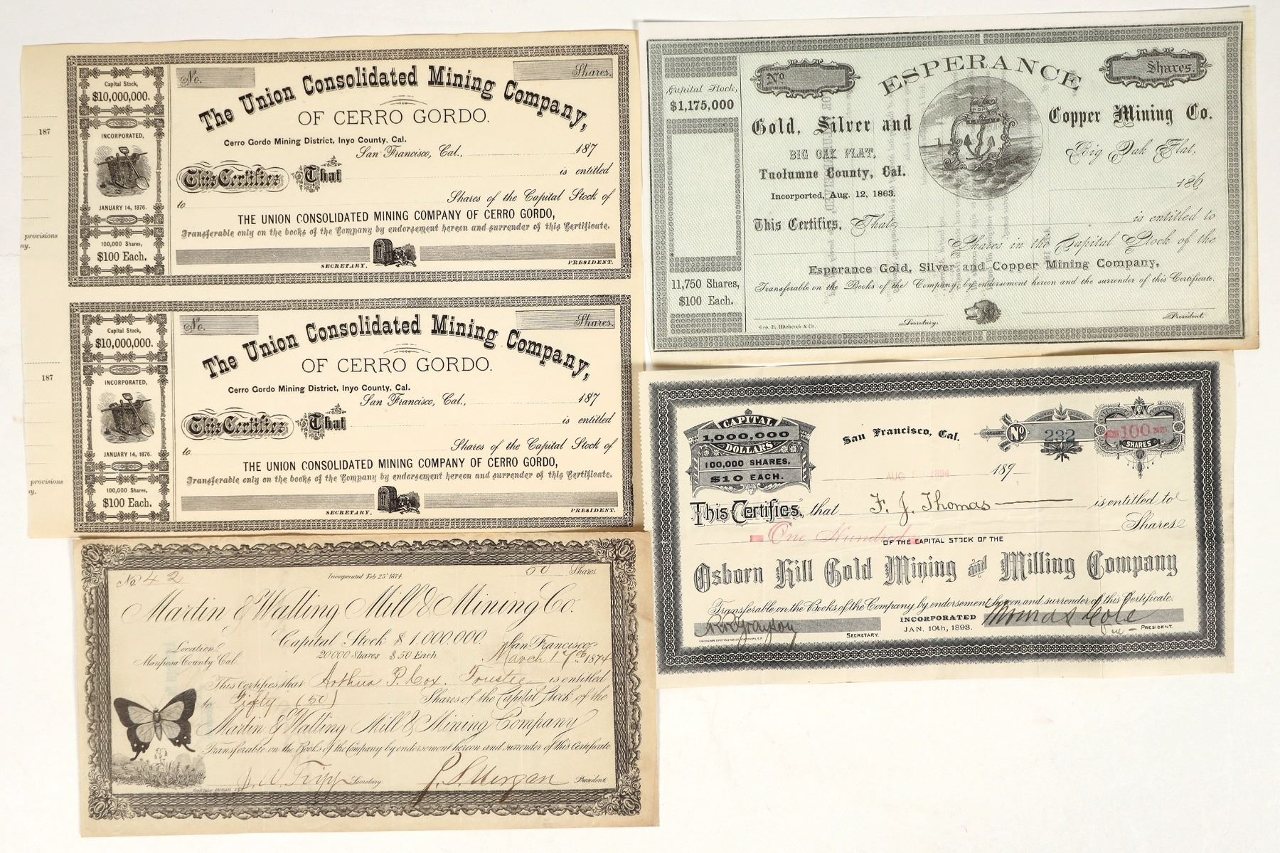 Lot of 5. 1.I/U. Osborn Hill Gold Mining and Milling Co. issued Aug. 1894. Incorp. 1898. NO vignettes. Cunningham, Curtis & Welsh printer. 2. U/U. Two Cerro Gordo Mining District, Inyo County, Cal. printed below title. Dateline San Francisco, 1870s. Inc. in 1876. Two vignettes, mining equipment (left) and dog next to safe (bottom center). Very good condition.3. Esperance Gold, Silver and Copper Mining Co. U/U, ,, Location, Big Oak Flat, Tuolumne County, Cal., dateline 186_. 4.I/U. Martin & Walling Mill & Mining Co.., issued 1874. #42 for 50 shares to Arthur P. Cox, trustee. Signed by J. Tripp. Geo H. Baker printer. Fold, no tears or ragged edges.