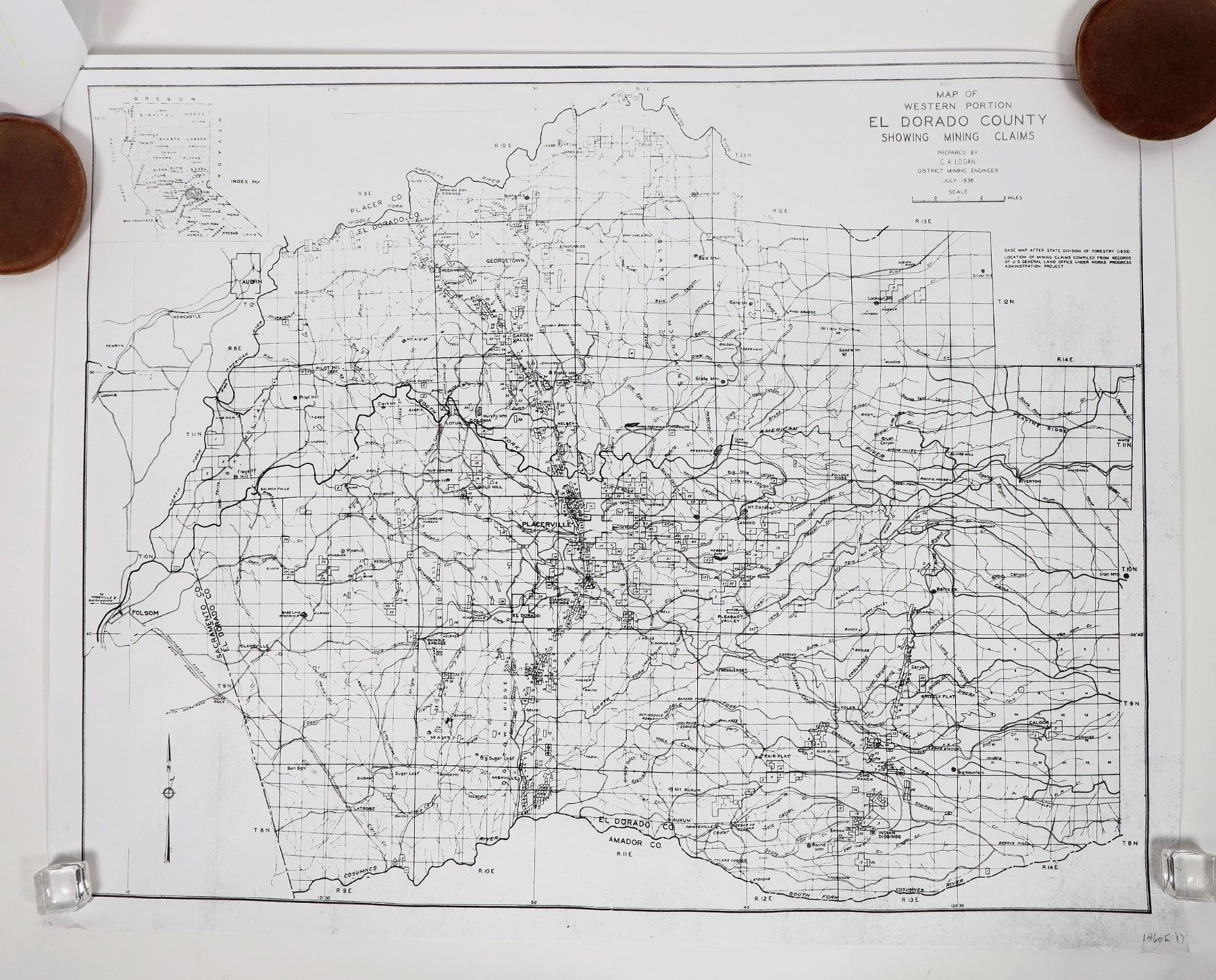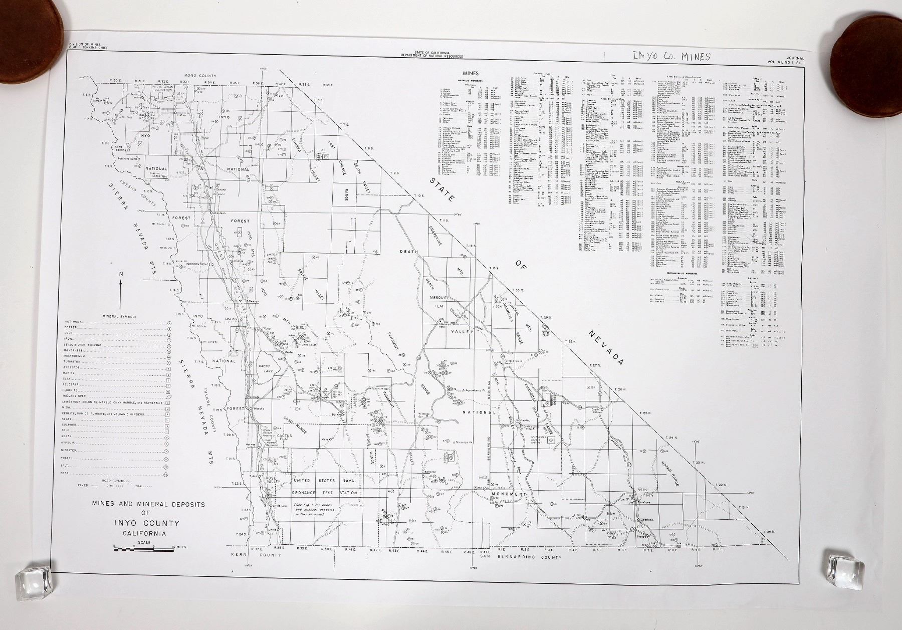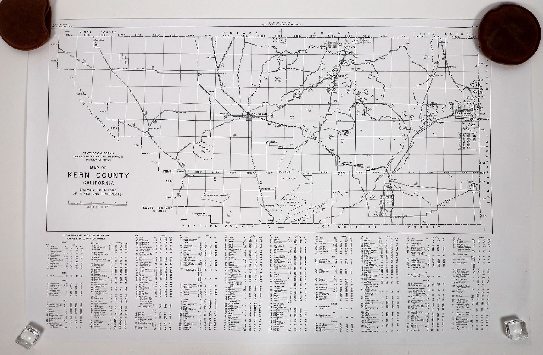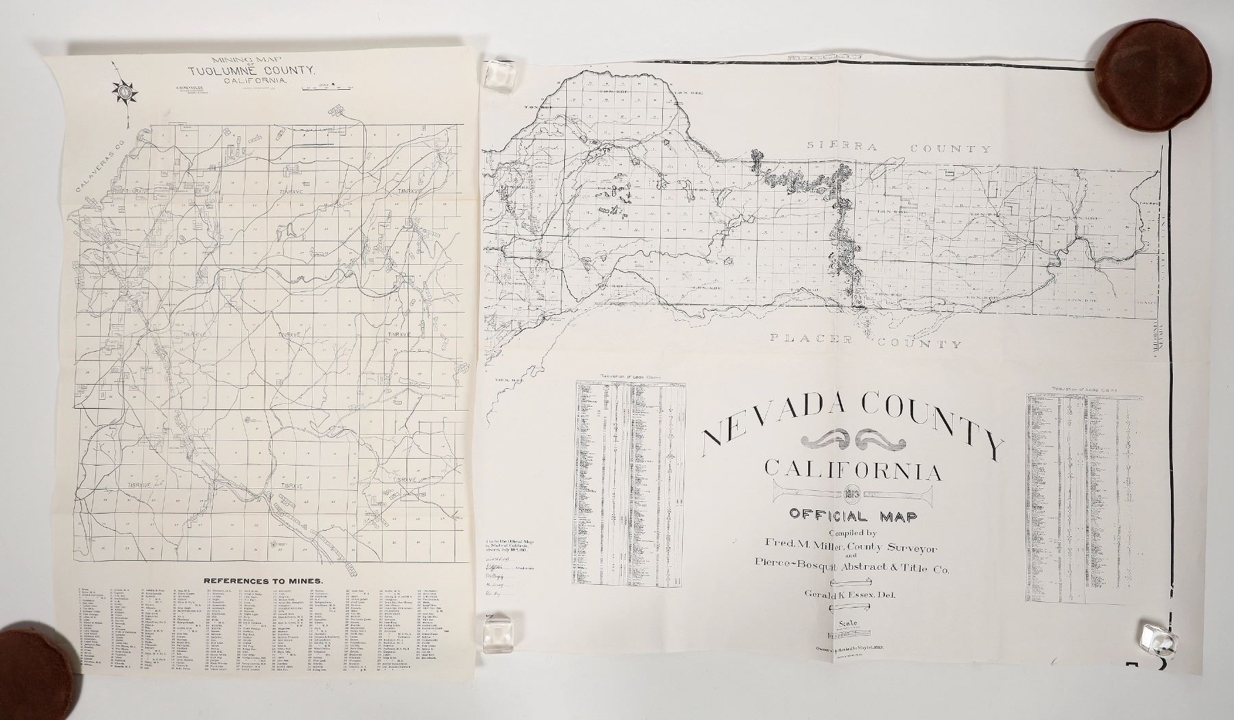 Nevada county-1913, 694 mines, 29x24". El Dorado county-1938, 647 claims, 24x18". Tuolumne county-1899, 304 mines, 17x25". Inyo county-Plate 1 from 1951 Mines & Minerals Deposits, 305 locations 36x24". Kern county, plate 17 from 1949 Mines & Prospects, 339 mines and prospects, 40x23".