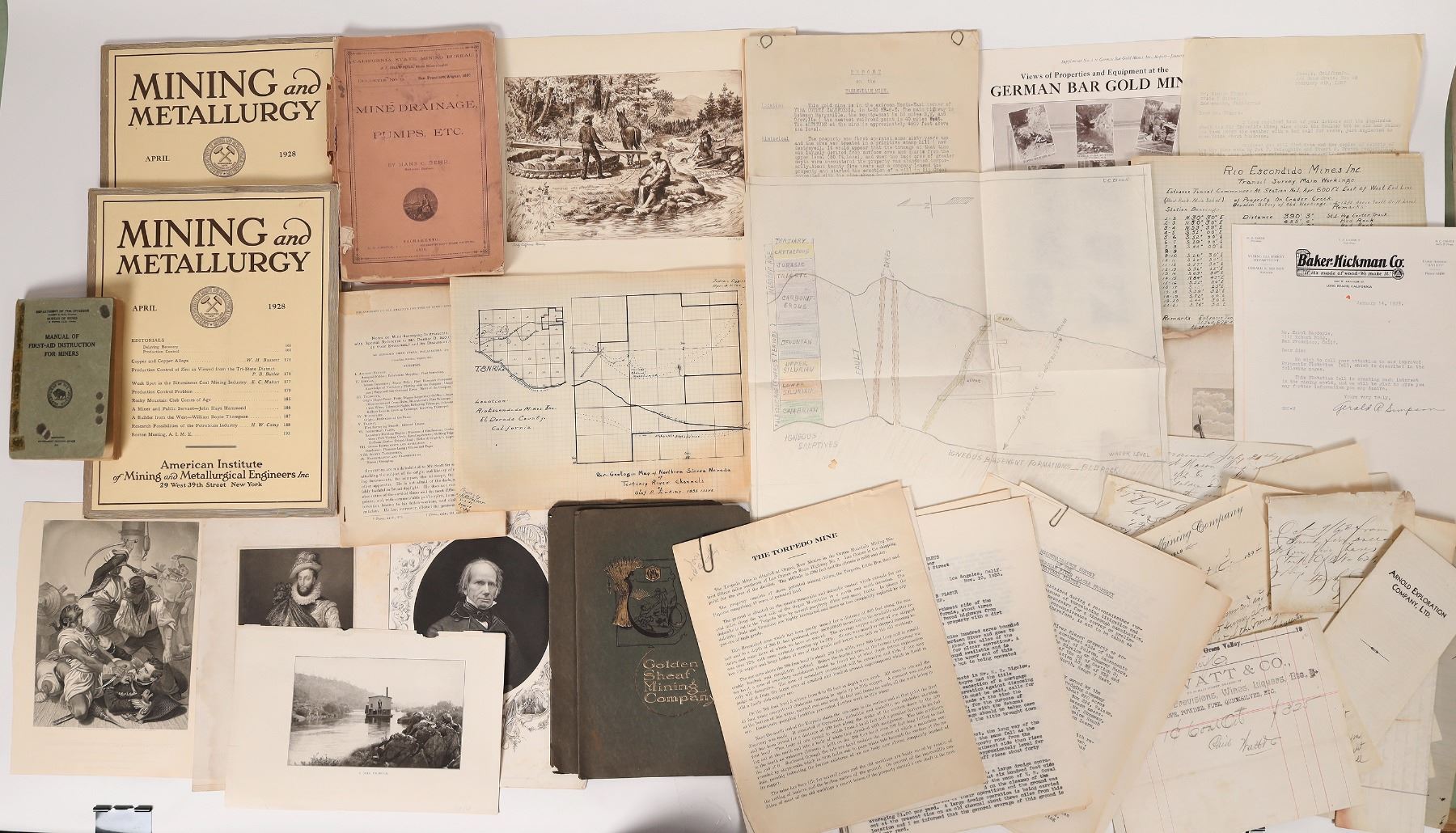 An assortment of papers and booklets related to mining in California, including reports from The Golden Sheaf Mining Company, The Eagleville Mine in Yuba County, a book about miner first aid, booklets advertising drill bits and other equipment and a few prints depicting life as a miner. Please see photos for more details. Sacramento California