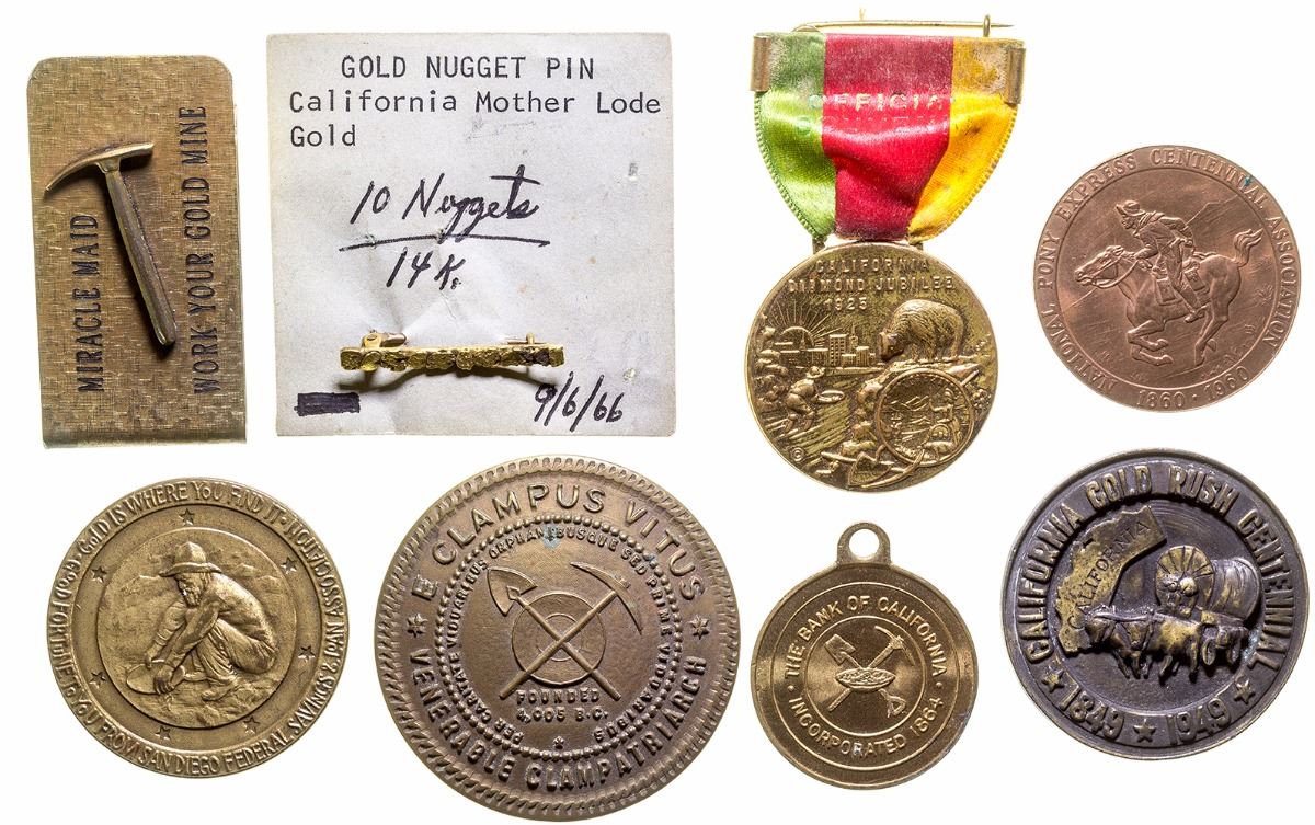 Gold nugget pin, 1 1/8". Six medals: san Diego Federal Savings & Loan, 1885-1955, nice embossed image of miner; E. Clampus Vitus medal; Bank of California; California Gold Rush Centennial; Pony Express Centennial;California Diamond Jubilee. Money clip. State: California City: Date: FHWAC#: 39654