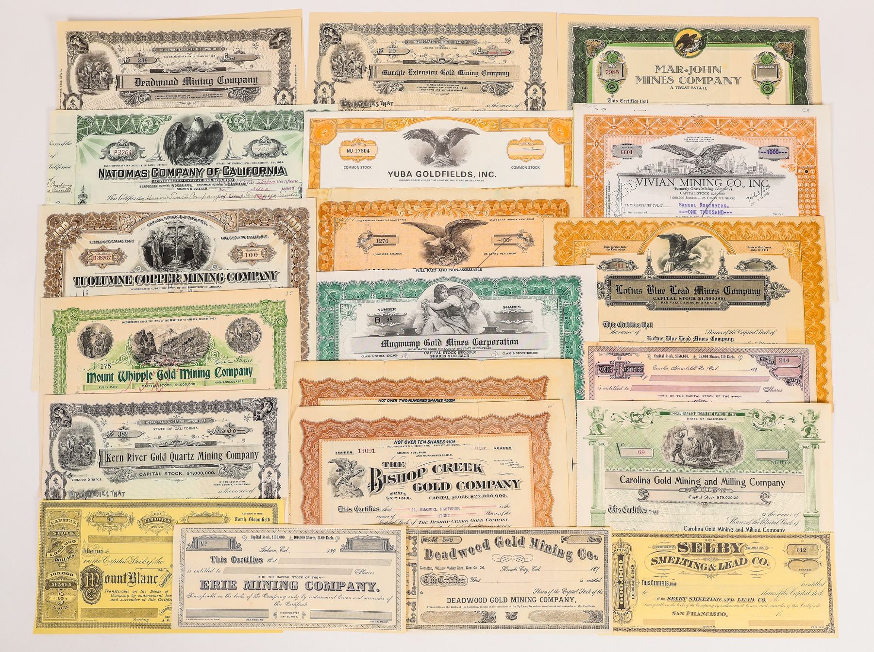 Lot of 21. Includes: Selby Smelting & Lead Co. (uniss.); Carolina Gold Mining & Milling Co. (uniss.); Bishop Creek Gold Co. (2 stocks, 1909, Inyo County); Mount Whipple Gold Mining Co. (1919); Erie Mining Co. (uniss.); Tuolumne Copper Mining Co. (1922); Mugwump Gold Mines Corp. (uniss.); Loftus Blue Lead Mines Co. (uniss.); Gruss Mining Co. (1920); Vivian Mining Co., Inc. (1942); Kern River Gold Quartz Mining Co. (1896); Eureka Mining Co. (uniss.); Mount Blanc Cons. Gravel Mining Co. (uniss.); Yuba Gold Fields (1975); Natomas Co. of California (1919); Mar-John Mines Co. (uniss.); Murchie Extension GMC (corp. sigs., but not issued); and Deadwood Mining Co. (3 uniss. stocks). Please inspect.