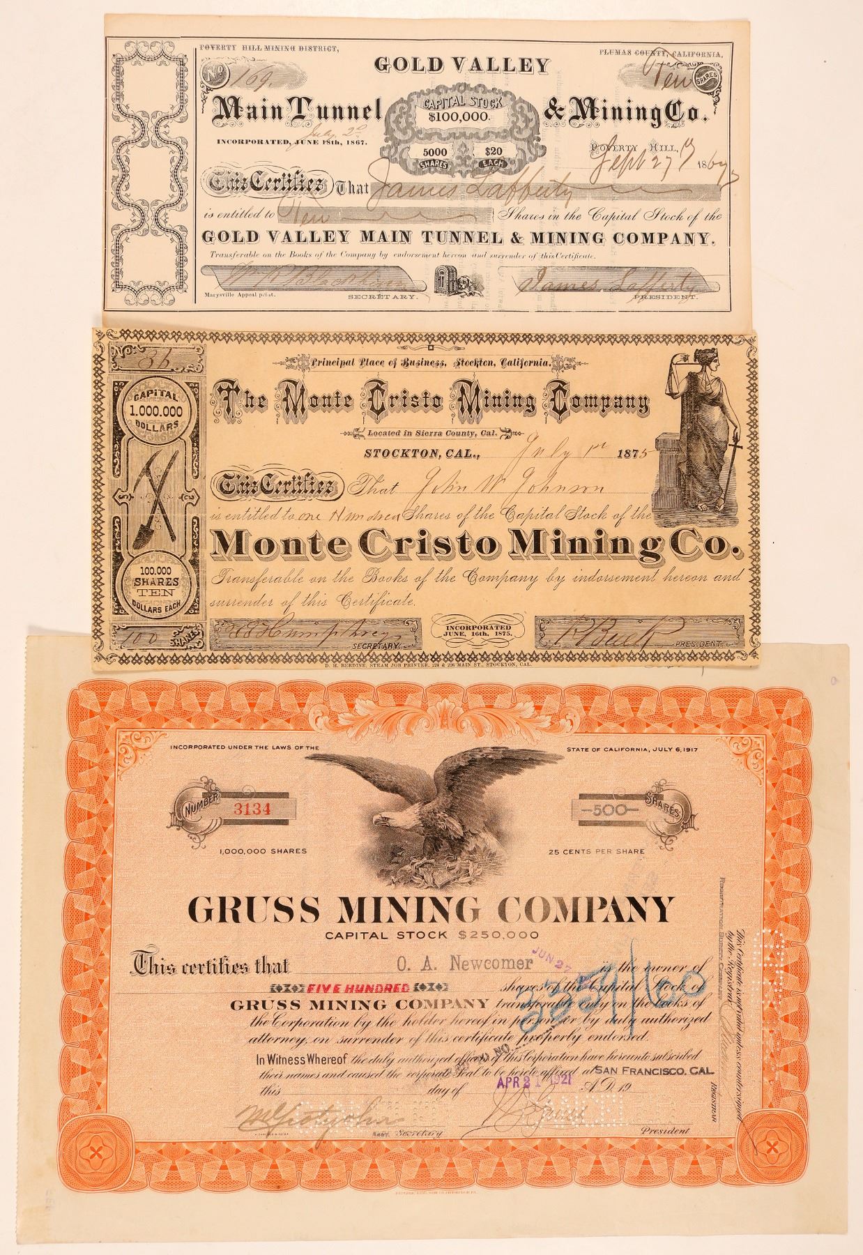 3 California mining certificates: 1) Gold Valley Main Tunnel & Mining Co @ $20 each issued to and signed by James Lafferty, pres. Located in Plumas Co., CA in Poverty Hill Mining District. Inc June 18, 1867. Vignette of dog by box. Printed: Marysville Appeal print. 2) 100 shares @ $10 each for Monte Cristo Mining Company cert. # 86 issued to John W. Johnson. Inc. June 16, 1875. Principal place of business, Stockton, CA, located in Sierra County, CA. Printed: D. H. Berdine, Steam Job Printer, 224 & 226 Main St. Stockton, CA. 3) 500 shares @ 25 cents per share cert. # 3134 for Gruss Mining Co. issued to O.A. Newcomer on Apr 21, 1921. Inc. CA, July 6, 1917. Orange border with raised company seal. Vignette of eagle with spread wings. Workings include underground opening(s) totaling 288.04 meters in length and an overall depth of 121.92 meters including a 400 foot deep vertical shaft with 3 levels at 70, 200 and 400 feet. Mine produced Copper in its early days and then gold during the 1890's. Production was $460,000 in 1918, mostly in gold. Printed: A. Carlisle & Co. SF.