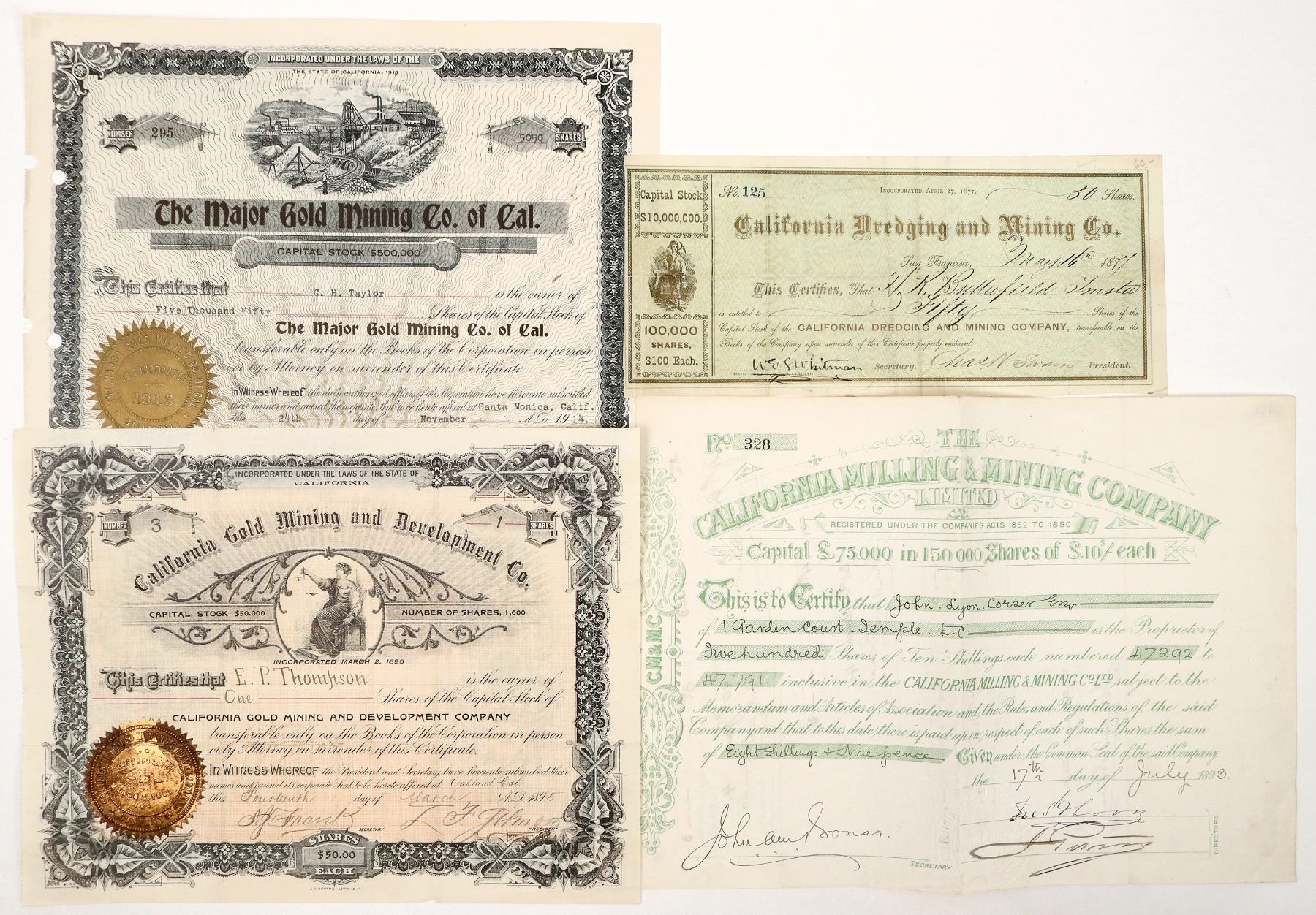 A group of four stock certificates from California-based mining companies, dating from 1877 to 1914. The companies in question are the California Milling & Mining Company, California Dredging & Mining Company, Major Gold Mining Co. of California, and California Gold Mining and Development Company. All are signed by the president/director and secretary of their respective company; three bear the official seal of their company. All are in very good condition.