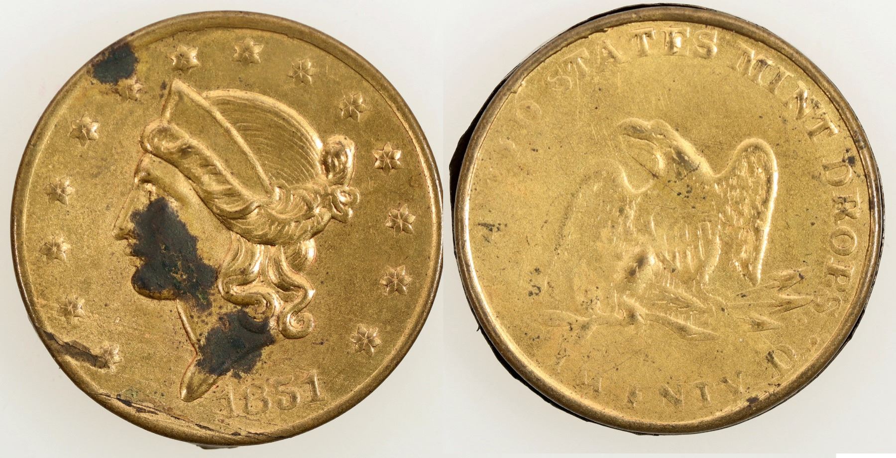 Rare, gilt, brass, 34 mm coin box. Liberty Head obverse / 1851; reverse: United States Mint Drops/ (pictorial eagle) / Twenty D. Overall Fine condition with stains on obverse.
