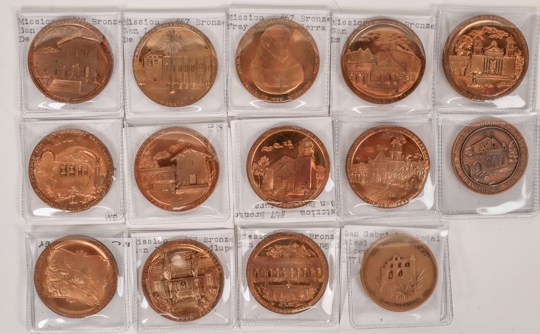 14 bronze California medals by Medallic Art Co., NY. San Rafael, San Gabriel, San Miguel, San Luis Rey, San Luis Obispo, San Jose de Guadalupe etc. About 1.6". California