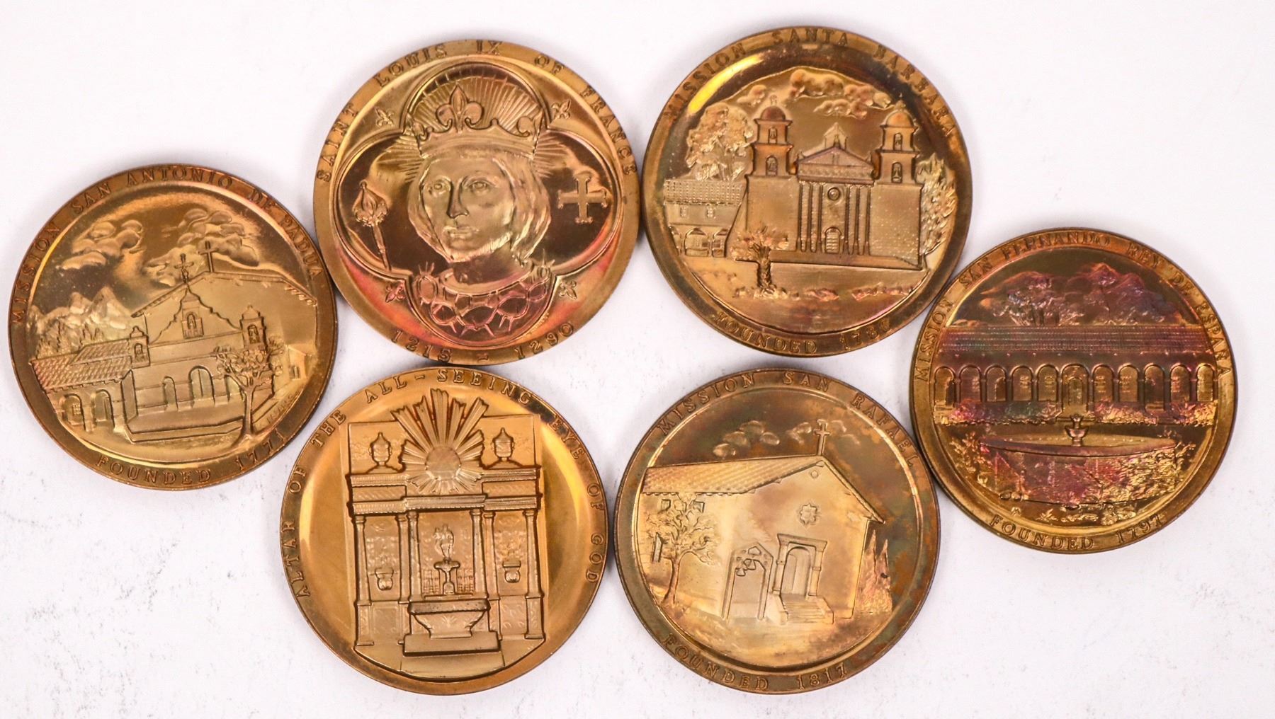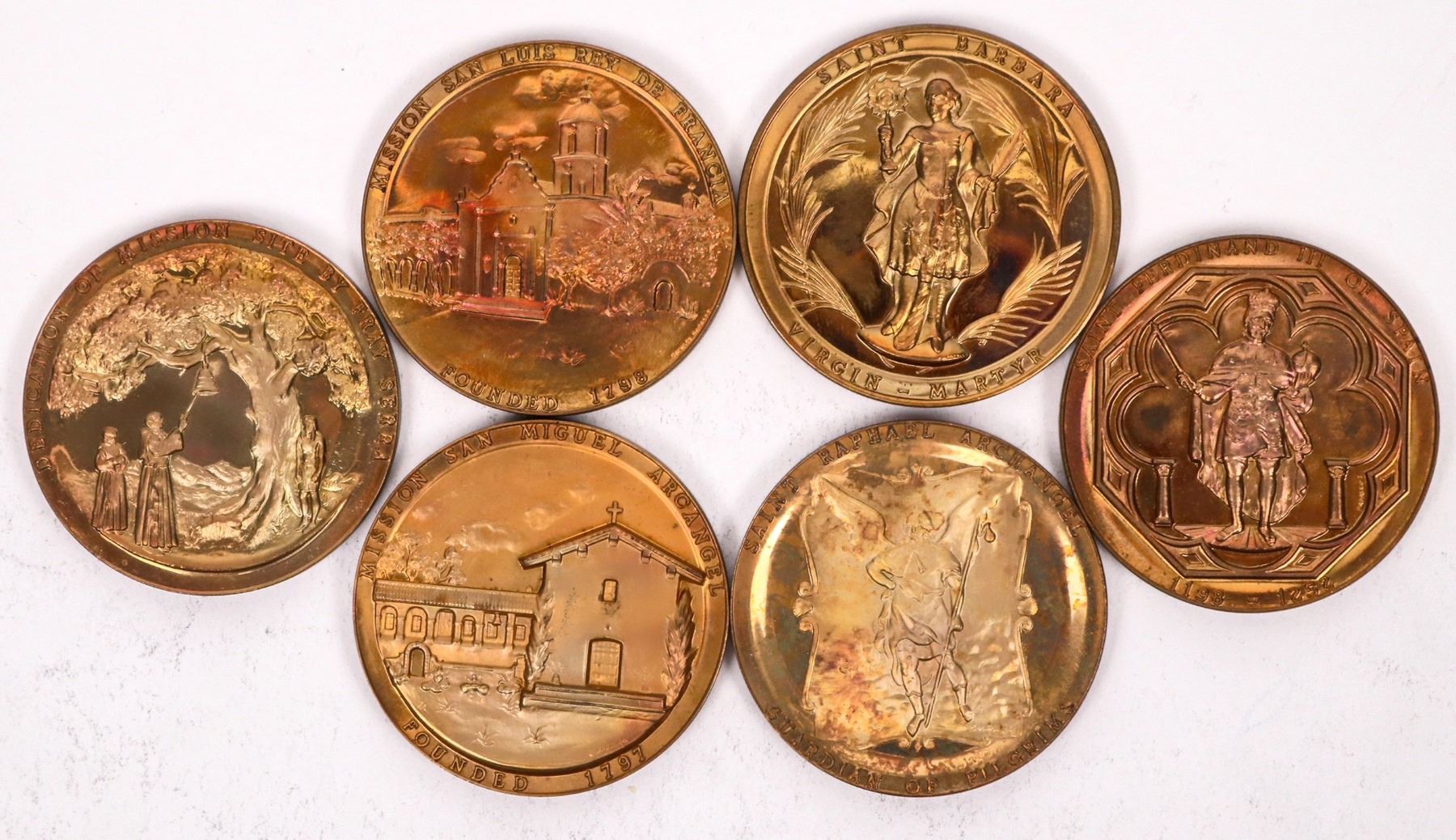 Six different proof like bronze medals made by Medallic Arts of New York: San Antonio De Padua; San Migeul Arcangel; Santa Barbara; San Fernando Rey de Espana; San Luis Rey de Francia; San Rafael Arcangel.