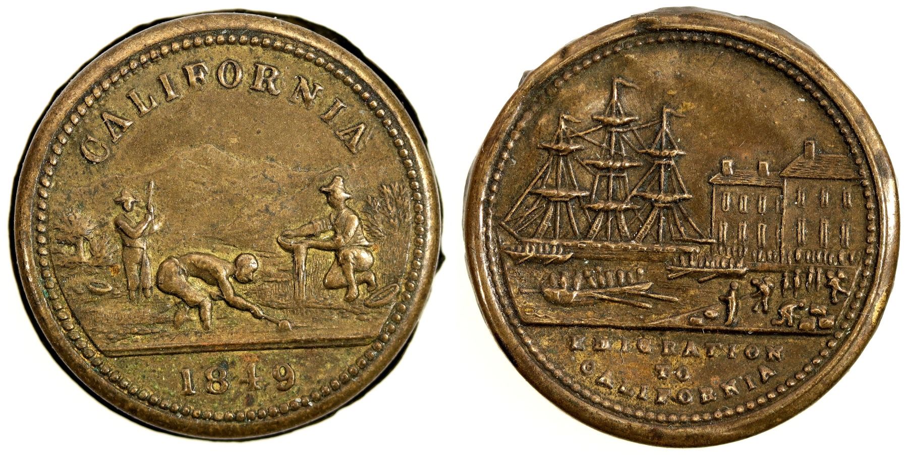 Tiny metal box (23 mm): California / (pictorial miners) / 1849 // (pictorial harbor scene) / Emigration / To / California. Size of a five dollar gold piece counter, attributed to Joseph Moore of Birmingham, England.