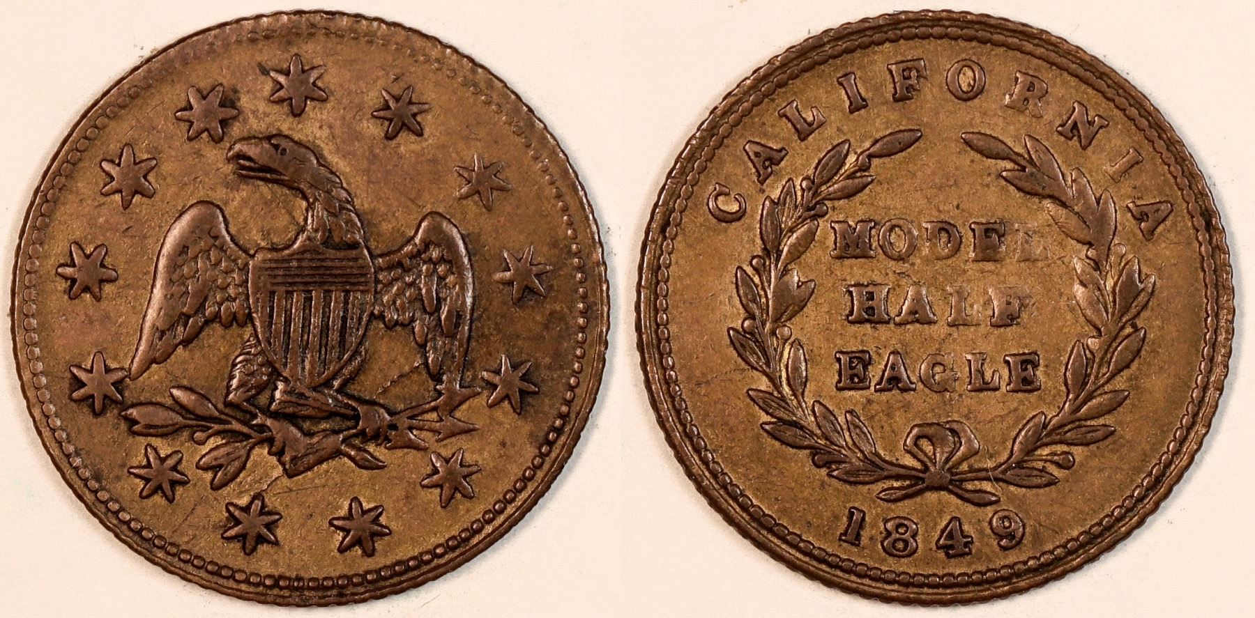 Obv.: California / Model / Half / Eagle / 1849; Rev.: eagle -580; Br. rd., 18 mm.