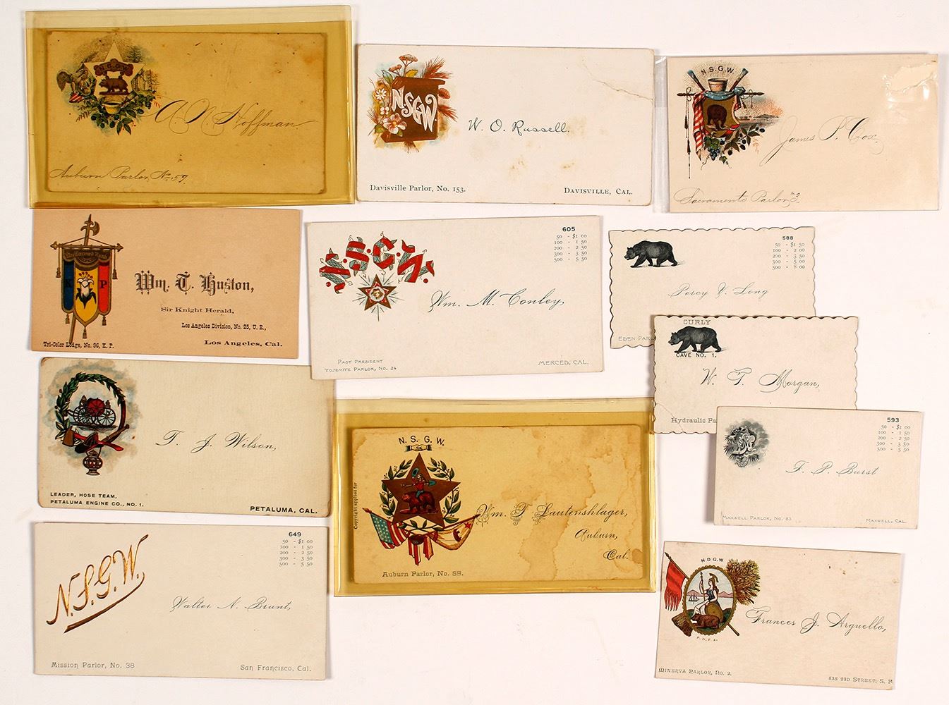 Lot of 12 pictorial, colorful member cards.. Most are NSGW including: Sacramento, Maxwell, Hayward, Nevada City, Davisville, two Auburn, Merced, and San Francisco. Also a NDGW card (San Francisco), a Knights of the Pythias card for a member in Los Angeles, and pictorial Petaluma fireman card for T.J. Wilson, Leader, Hose Team, Petaluma Engine Co. No. 1. Please inspect. (Prag Collection) Date: Location: California HWAC # 55618