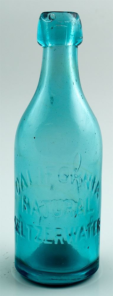California Natural Seltzer Water. H & G with an embossed bear on the reverse. This is one of the more popular California pictorial soda bottles because it comes in numerous colors. This example is in an ice blue to medium aqua example. The company was in business from 1875 to about 1885. City: State: California Date: Inventory# 40909